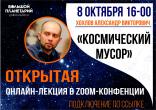 В рамках Всемирной недели космоса в Детско-юношеском центре «Планетарий» 8 октября в 16.00 пройдет открытая онлайн-лекция «Космический мусор» (площадка проведения ZOOM-конференция), лектор – Хохлов Александр Викторович, популяризатор космонавтики, член северо-западной организации Федерации космонавтики России.