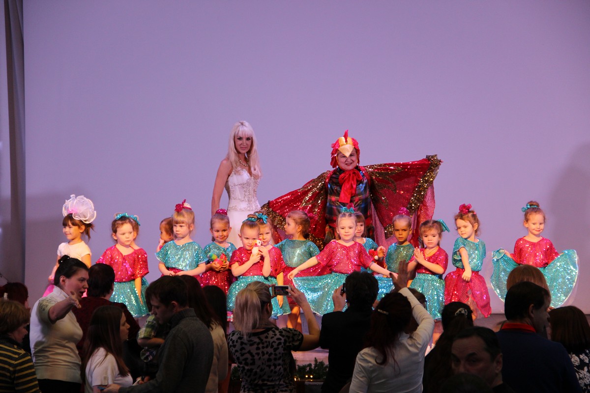 Конечно же, основой сценария концерта стали новогодние истории. Их поведали ведущая, похожая на Снегурочку, в роли которой выступила руководитель «Маленьких звездочек» Елена Анатольевна Романовская и Огненный Петух, восточный символ 2017 года, в роли которого выступила Елена Вячеславовна Розенталь. Дедушка Мороз, как и полагается, спешил к ребятам сквозь пургу и метели, чтобы вручить им новогодние подарки. Первыми их заслужили маленькие 4-5-летние танцующие «обезьянки» как символы уходящего года. Детские и эстрадные танцы в исполнении самых маленьких участниц всегда заряжают своей динамикой и энергетикой.