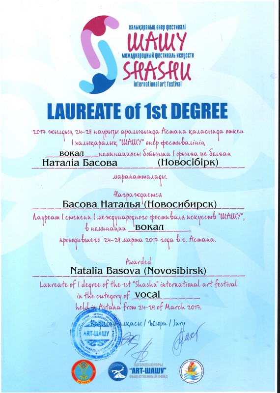 Наталья Басова стала лауреатом I степени Международного фестиваля искусств «Шашу»