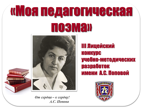 Педагогическая поэма 22-ой школы написана и пишется по сей день всеми нами: учителями, учениками, родителями, выпускниками. 6 апреля в лицее № 22 «Надежда Сибири» состоялось подведения итогов третьего ежегодного конкурса учебно-методических разработок имени А.С. Поповой «Моя педагогическая поэма». Этот день стал обращением к лицейским традициям и памяти, для того, чтобы написать еще одну страницу в бессмертной книге об учителе!