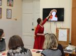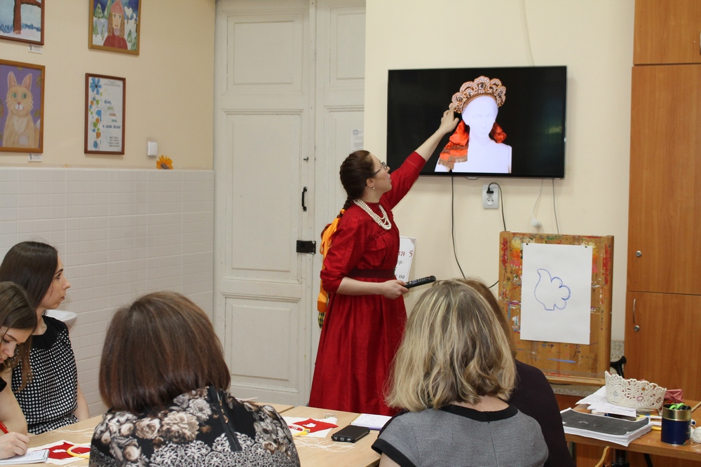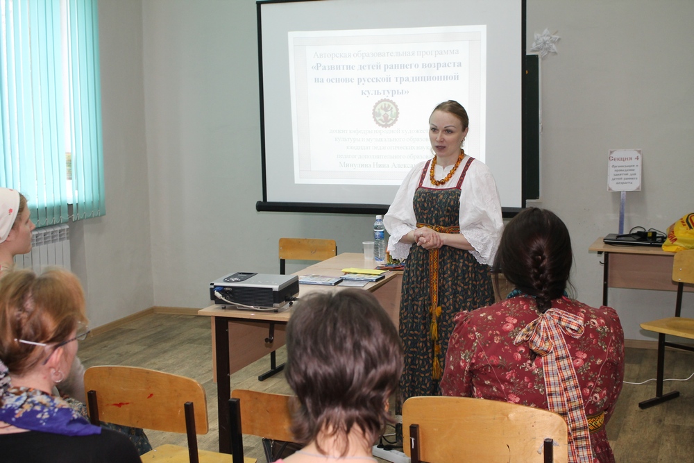 Четвертая секция помогла интересующимся дошкольным воспитанием познакомиться с методикой организации и проведения занятий для детей раннего возраста (1,5-3 года) на основе русской традиционной культуры. Мастером на этой секции выступила Чикунова Нина Александровна, заведующая кафедрой Народной художественной культуры ИКИМП НГПУ, кандидат педагогических наук.