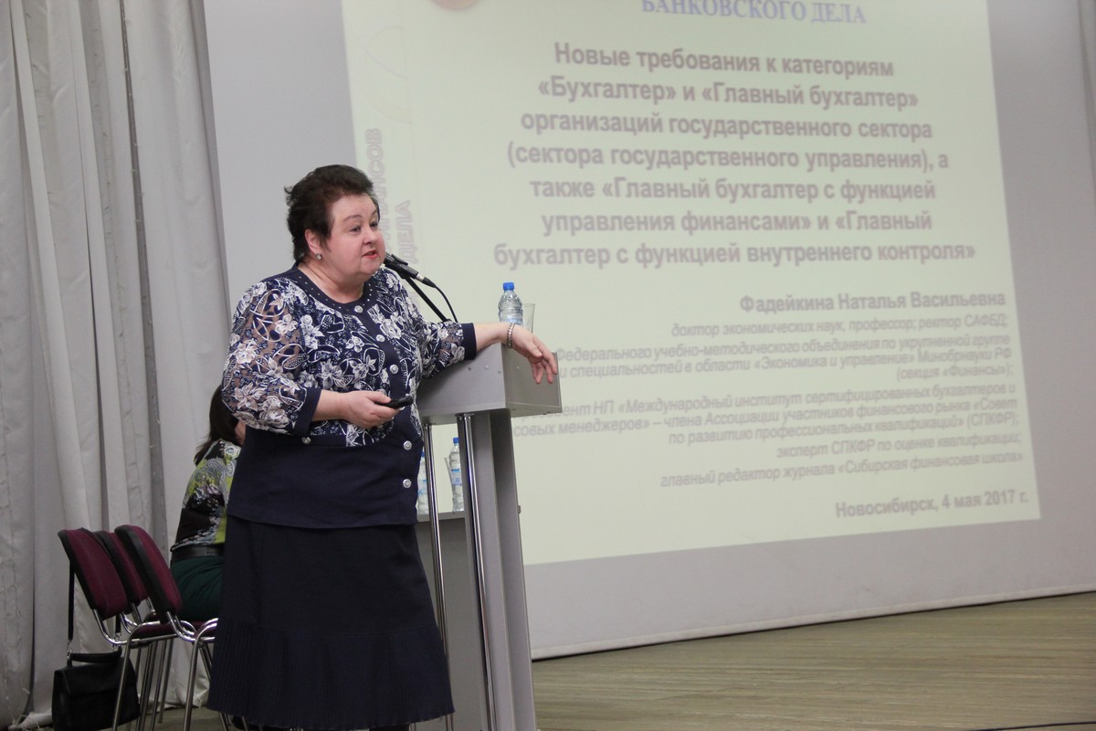 Наталья Васильевна Фадейкина, ректор Сибирской академии финансов и банковского дела, доктор экономических наук, профессор, прокомментировала новые требования к категориям бухгалтер, главный бухгалтер организаций государственного сектора (сектора государственного управления), а также главный бухгалтер с функцией управления финансами и функцией внутреннего контроля. Перечислила нормативно-правовые акты, регламентирующие внедрение профессиональных стандартов к категориям бухгалтер, главный бухгалтер организаций государственного сектора.