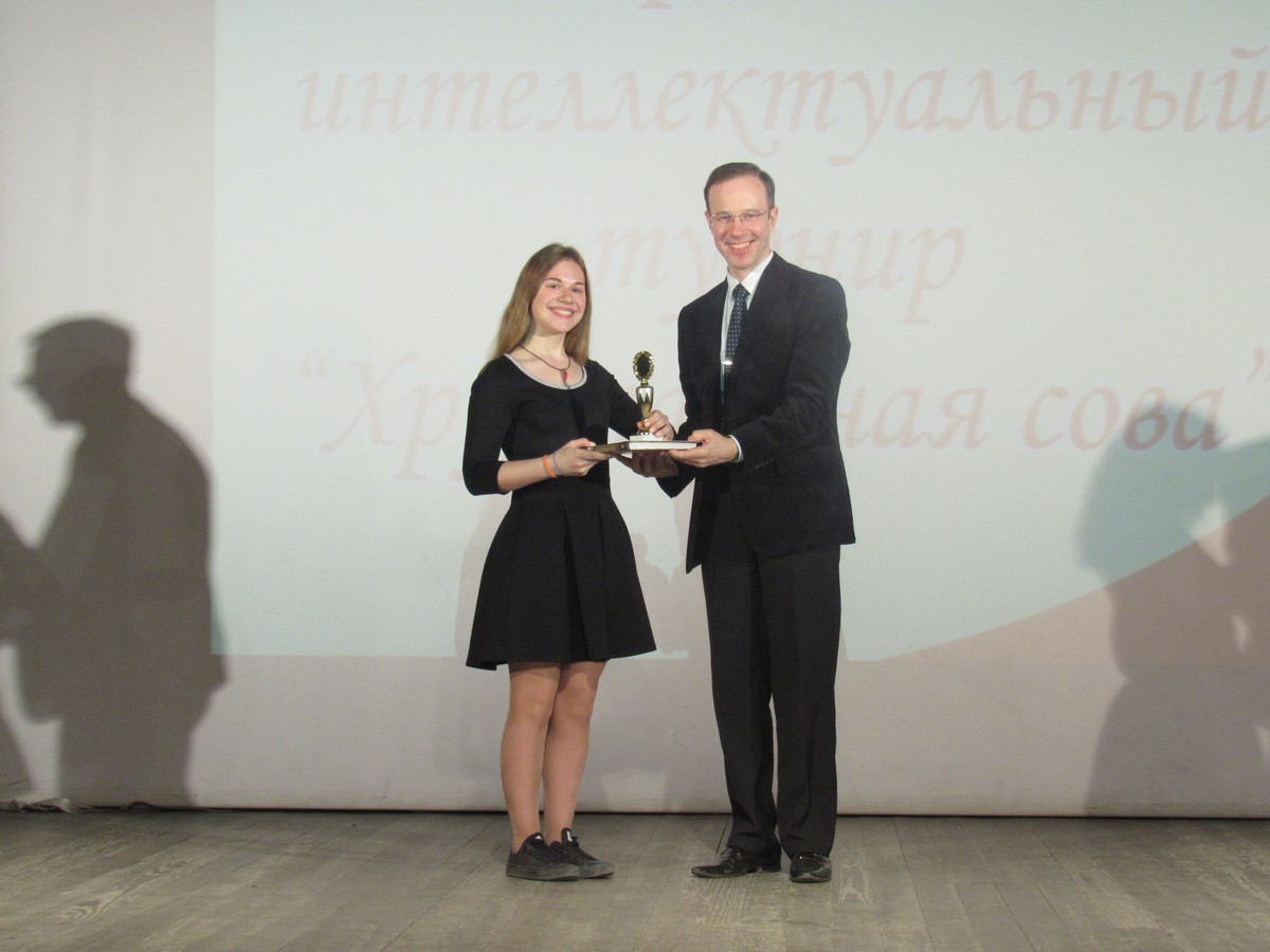 А поздравляли и награждали лучшие команды начальник отдела общего образования департамента образования мэрии города Новосибирска Лариса Александровна Аникина, авторы турнира «Хрустальная сова» для старшеклассников – директор Новосибирского филиала телекомпании «5 канал «Санкт-Петербург» Максим Валерьевич Безбородов и педагог ДТД УМ «Юниор» Ольга Валерьевна Новик, а также руководители городских клубов интеллектуального развития, представители АМКИР.