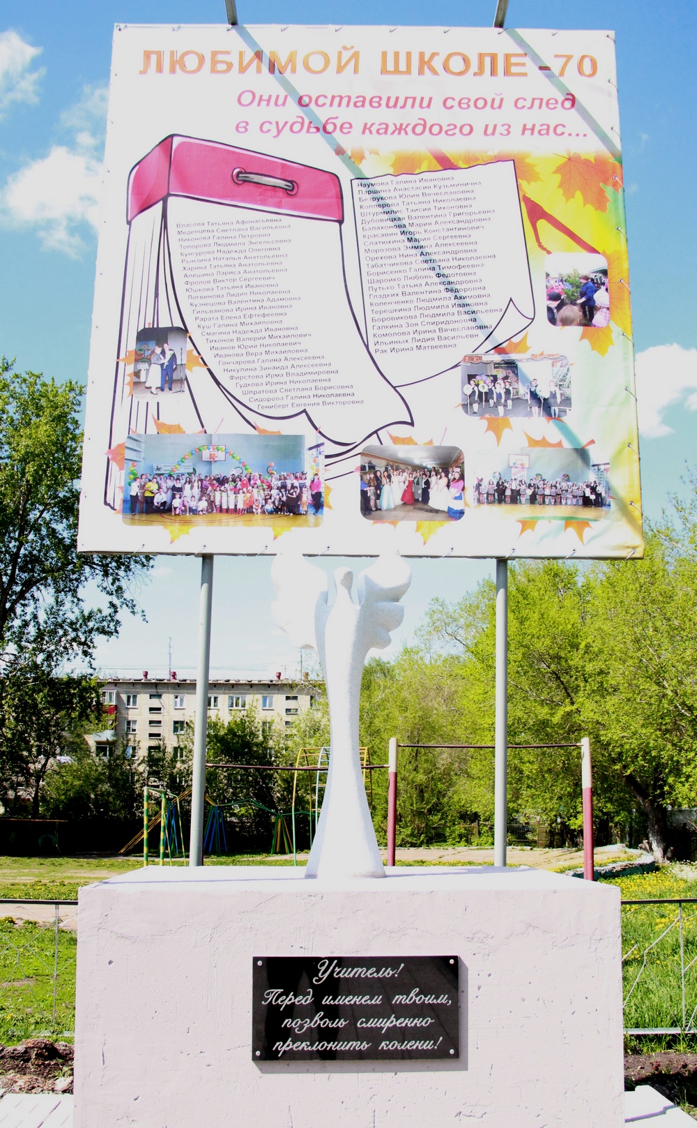 Реализация проекта началась весной 2016 года, когда 25 апреля был заложен парк «Учитель – герой нации». Каждый класс совместно с ветераном школы посадил 70 именных пихт в его честь и в честь учителей, ушедших из жизни. За год была благоустроена территория вокруг аллеи, появился огромный банер, на котором изображён символический отрывной календарь с именами и фамилиями учителей школы, которых помнят и любят, вывешены картины учеников-победителей конкурса «Из года в год, из десятилетия в десятилетие люби, храни родную школу, ученик!». И вот сегодня завершающий этап большого проекта – открытие стелы «Учителю посвящается…».