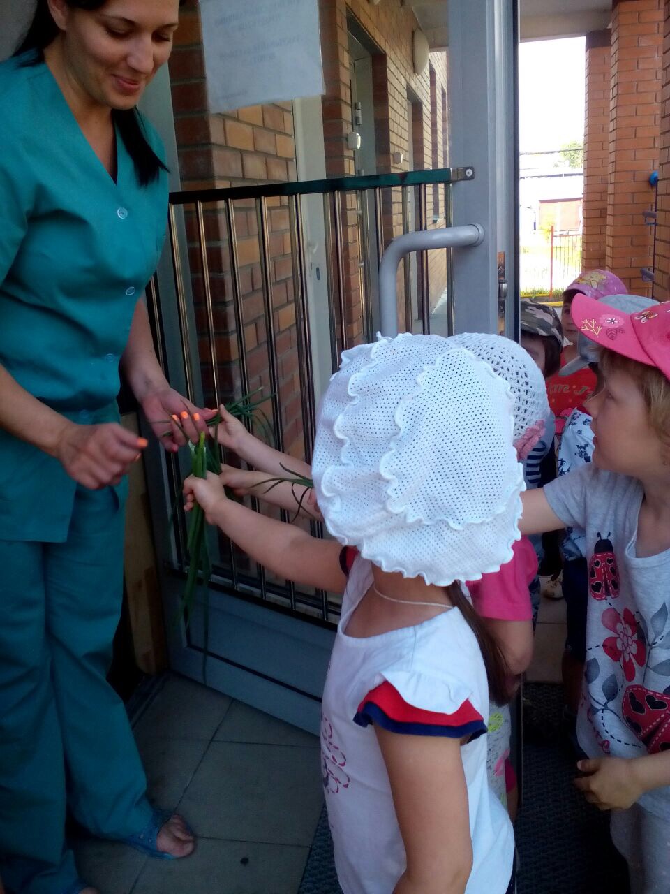 Мы начали с того, что на нашей небольшой территории выделили участок для огородных дел, огородили его плетнем, поставили садовые скамейки, на которых дети могут наблюдать за растениями, отдыхать после выполненных поручений, заниматься совместной деятельностью с воспитателем. Каждая группа выбрала себе грядку, которую заполнила землей, обработала и посадила какую-то культуру. Так, старшие дети группы «Радуга» посадили викторию, средняя группа «Полянка» – огурцы в парник; «Паровозик из Ромашково» – репу; «Кораблик» – морковку и свеклу, а самые маленькие дети – лук. Вдоль забора посадили кусты смородины и кабачки. Дети под руководством воспитателей ухаживают за грядками: им приходится рыхлить землю, поливать, бороться с сорняками. Вовлечены в процесс и взрослые. Так, папа Найман Лизы учил детей, как надо прореживать морковь, мама Вики Куницкой – обрабатывать викторию, а бабушка Артема и Веры Садыковых делилась с нами рассадой овощей и цветов. И самое главное достижение детского труда – сбор урожая! Надо было видеть, с какой радостью малыши собирали викторию с грядки, как смакуя, ели ее и рассказывали родителям, что слаще ягоды никогда не ели. А самые маленькие дети боязливо срывали зеленый лук и несли его на кухню повару на вытянутых руках. Воспитатель ясельной группы А. В. Зацепина рассказывала, что в этот день борщ съели все до одного, причем старались сначала выловить лук, а мамам говорили, что сегодня они суп сварили сами. Можно смело сказать, что огород в детском саду является одним из условий для осуществления экологического воспитания детей.