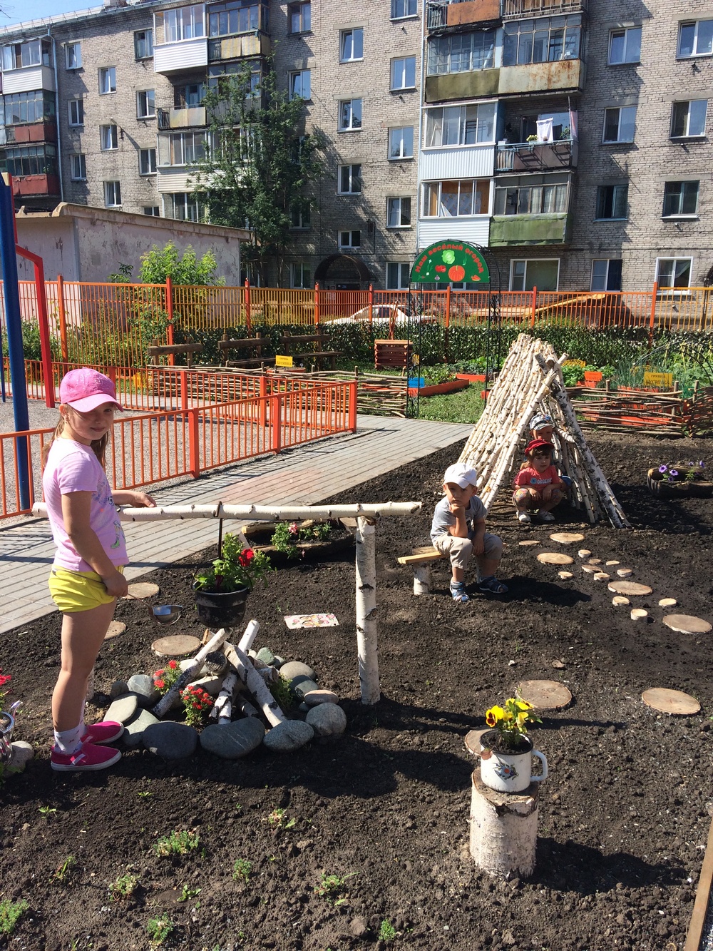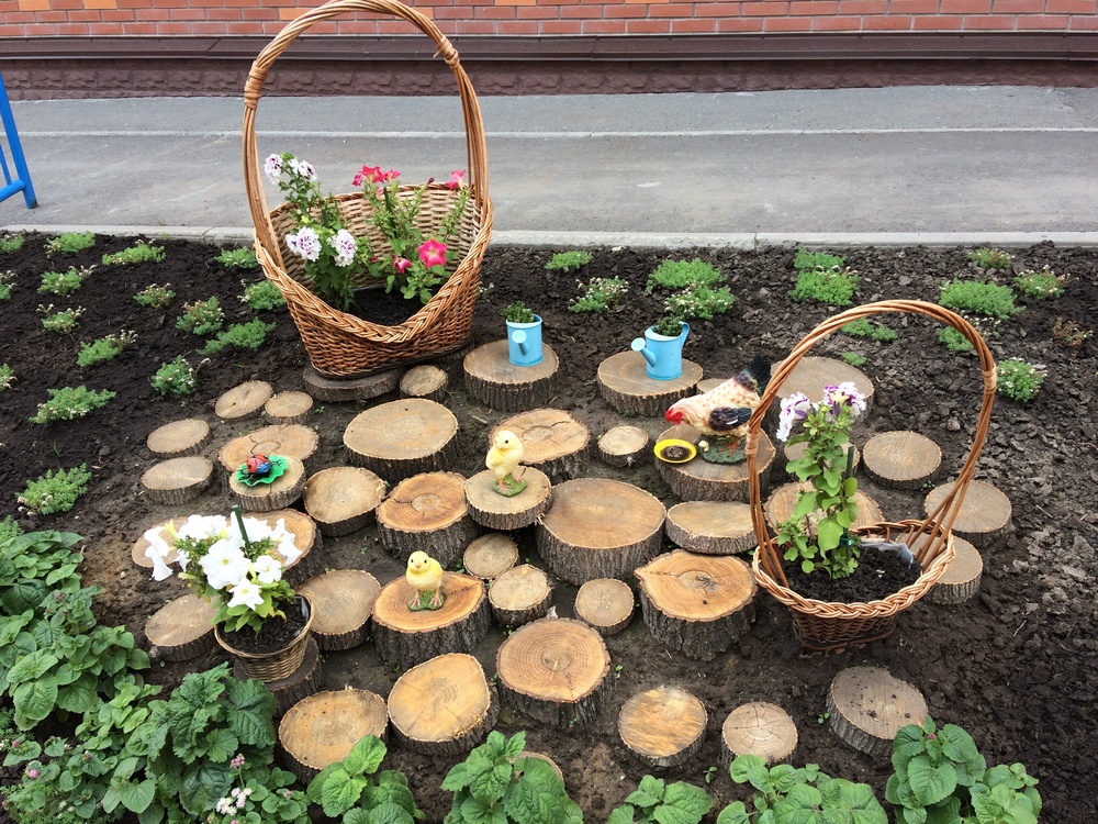Чтобы наш детский сад обрел свой индивидуальный стиль, мы обратили особое внимание на окружающую среду, призванную обеспечивать детям возможность полноценно развиваться, ведь благоустройство решает задачи эстетического, умственного, нравственного и физического воспитания детей через знакомство с окружающим растительным миром. Так, у нас появился пруд с уточками, аистом и лягушками; лесной уголок с шалашом и элементами туристического отдыха; композиция с цветочными корзинами на спилах деревьев; автоплощадка и, наша гордость, – настоящий огород!