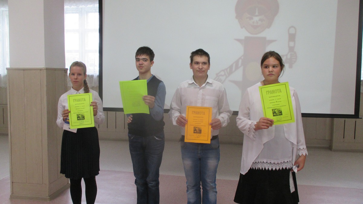 Учащиеся 5–9 классов продемонстрировали свои знания по ПДД в игре-викторине. Педагоги школы предложили детям разделиться на команды и побороться за звание «Команда лучших знатоков дорожного движения». Дети вспомнили и повторили правила поведения в общественном транспорте и на дороге, правила перевозки детей на автобусах и других транспортных средствах, название дорожных знаков.