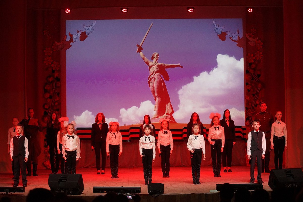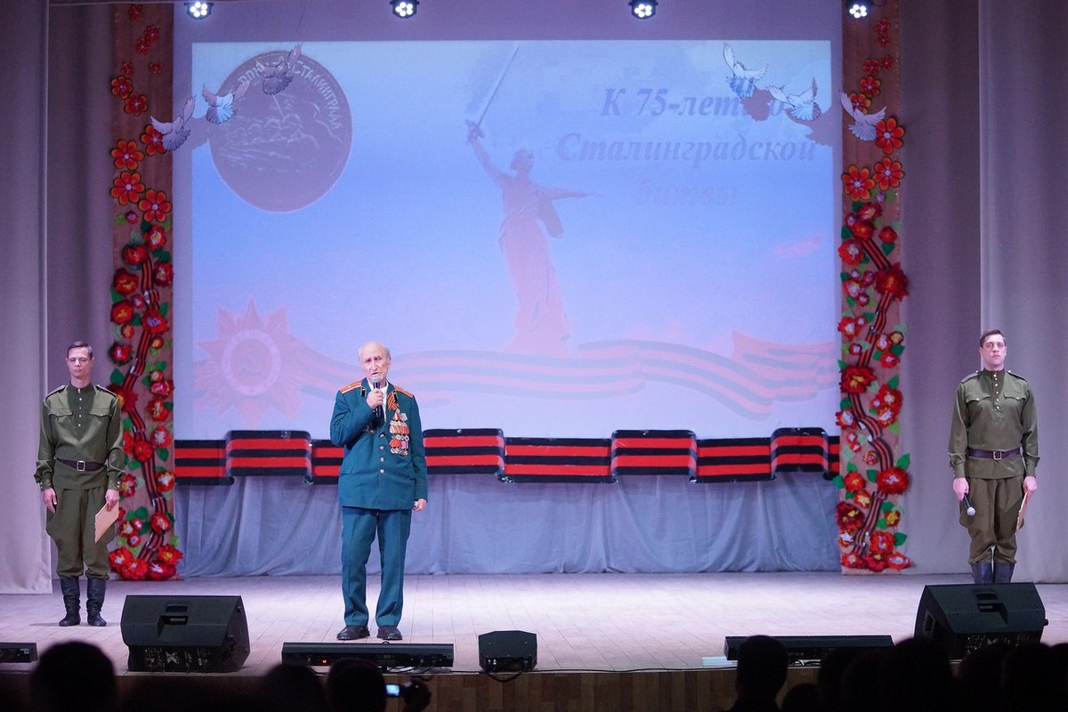 До начала мероприятия в зале звучали песни военных лет о Мамаевом кургане… Красные софиты, торжественные «Позывные», ведущие в солдатской форме военных лет, фанфары и стихотворение на фоне музыки погрузили зал в атмосферу той Великой битвы под Сталинградом. После вступительного слова ведущего на экране был показан документальный видеоролик «Сталинград. Бессмертный подвиг», который напомнил о тех событиях Сталинградской битвы, которые отходят всё дальше и дальше в историю, но никогда не сотрутся из памяти. На протяжении всего мероприятия зрители с замиранием сердца смотрели на сцену. Рассказ о героических подвигах сталинградцев не оставил никого из присутствующих равнодушными. Ведь именно такие мероприятия воспитывают подрастающее поколение настоящими патриотами своей Родины. После слов ведущих образцовый коллектив хореографическая студия «Юнона» выступил с хореографической композицией «Если б не было войны».