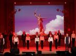 Вокальная композиция «Поклонимся великим тем годам» в исполнении образцового коллектива вокальной студии «Домисолька» звучала на фоне приглушенного света и освещения красных софит. Все присутствовавшие в зале стояли, пока звучала песня.
