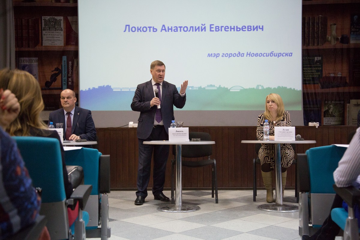 К участникам мероприятия с приветственным словом обратился мэр города Новосибирска А. Е. Локоть: «Проведение общегородских родительских собраний является очень эффективной формой взаимодействия педагогической и родительской общественности, когда можно получить обратную связь: услышать мнения родителей, узнать о наиболее волнующих их вопросах. Сегодняшнее собрание посвящено профориентации новосибирских школьников. Эту тему я считаю очень важной. Конечно, мне как мэру хочется, чтобы большинство наших выпускников остались в Новосибирске. В городе действует достаточное количество вузов разной направленности. Образование в Новосибирске считается одним из самых лучших в стране. Уверен, если ребята выбирают наши вузы и намереваются связать жизнь с родным городом, значит у нас большие перспективы на будущее». «Мы хотим ввести «Академические субботы», чтобы ученики 10-11 классов, посещая занятия, организованные вузами города, поняли, что такое система высшего образования и, возможно, определились с выбором будущей профессии», — подчеркнул мэр города.