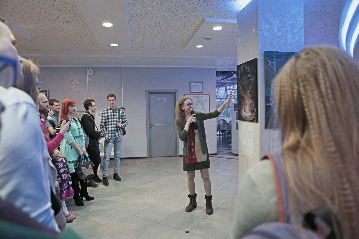 А после Анастасия Просочкина рассказала о том, как она пришла к теме космоса и где она черпает вдохновение. Познакомила гостей с каждой из представленных на выставке картин. И конечно же оставила автограф с пожеланиями на специально подготовленных открытках с изображением своих работ.