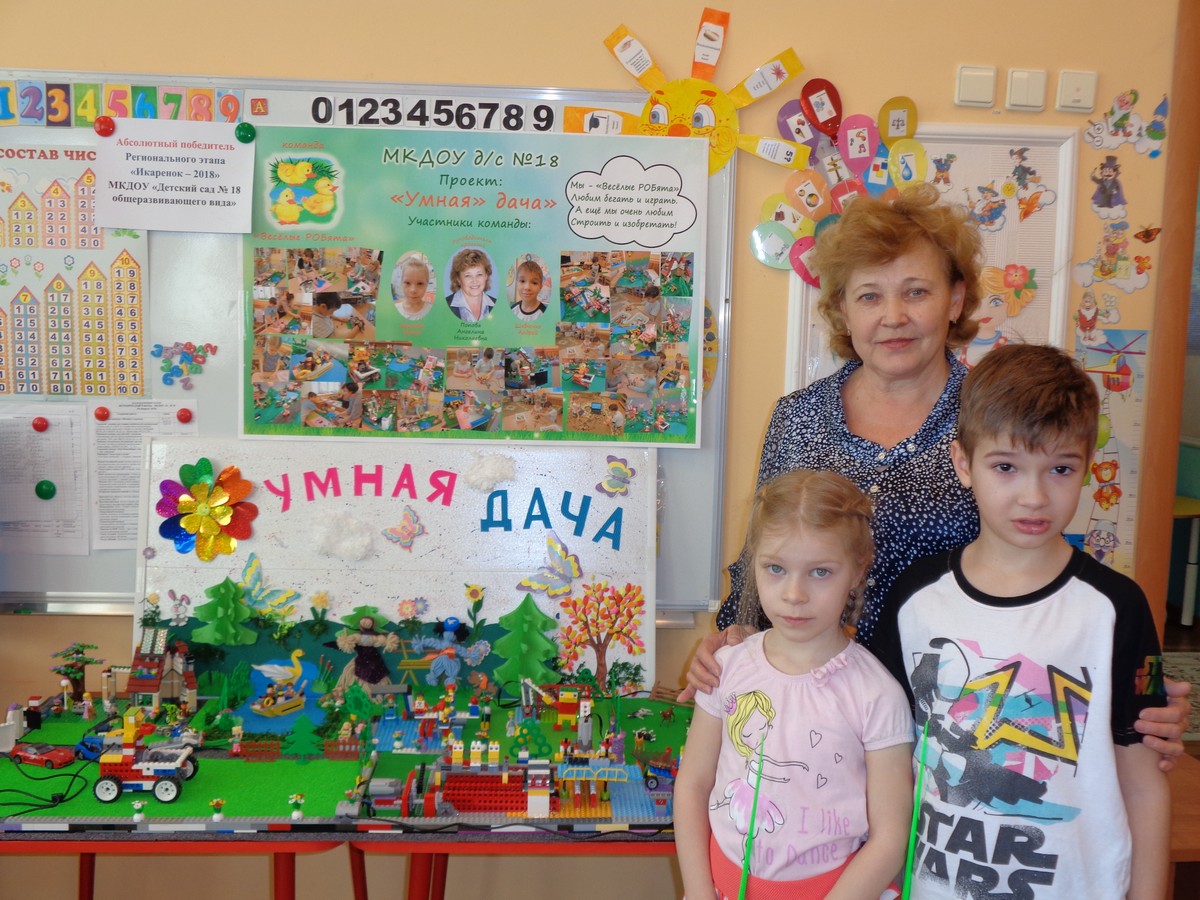 Одной из участниц форума стала команда «Веселые РОБята» детского сада № 18 Советского района в составе Башковой Ирины и Шевченко Андрея и их родителей. Руководила созданием проекта воспитатель Попова Ангелина Николаевна. Дети совместно со взрослыми разработали проект «Умная дача». Каких только роботов нет на этой замечательной «умной» даче!.. Это и робот-вратарь, который играет с детьми в футбол; газонокосилка, которая самостоятельно скашивает траву на территории дачи. Есть на участке качели, карусели, которые самостоятельно качают детей. А еще на участке дачи есть конвейер для кормления домашних птиц, а те в свою очередь несут полезные экологически чистые куриные яйца.