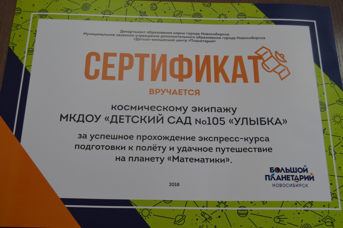 Сопровождал детей в этом увлекательном путешествии любимый мультипликационный герой Лунтик. С его помощью дети с честью справились с трудностями и к общей радости достигли, наконец, планеты «Математики», за что Лунтик вручил сертификат космическому экипажу детского сада № 105.