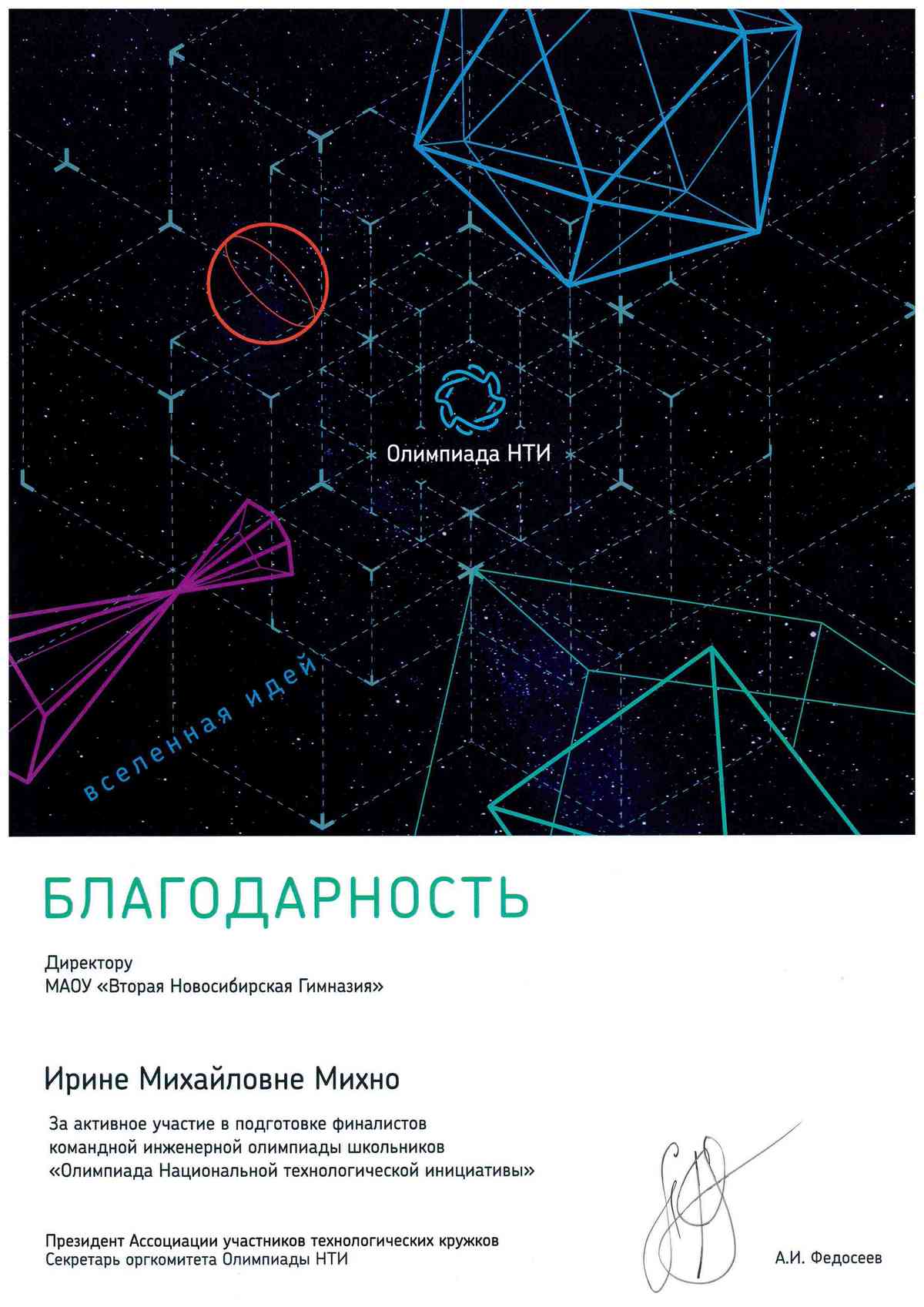 Организаторы Олимпиады Национальной Технологической Инициативы в знак благодарности педагогам и директору Второй Новосибирской гимназии Ирине Михайловне Михно передали благодарственные письма от имени президента Ассоциации участников технологических кружков и секретаря оргкомитета Олимпиады НТИ Алексея Игоревича Федосеева, в награду за самое большое количество подготовленных финалистов командной инженерной олимпиады школьников.