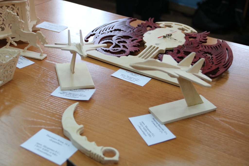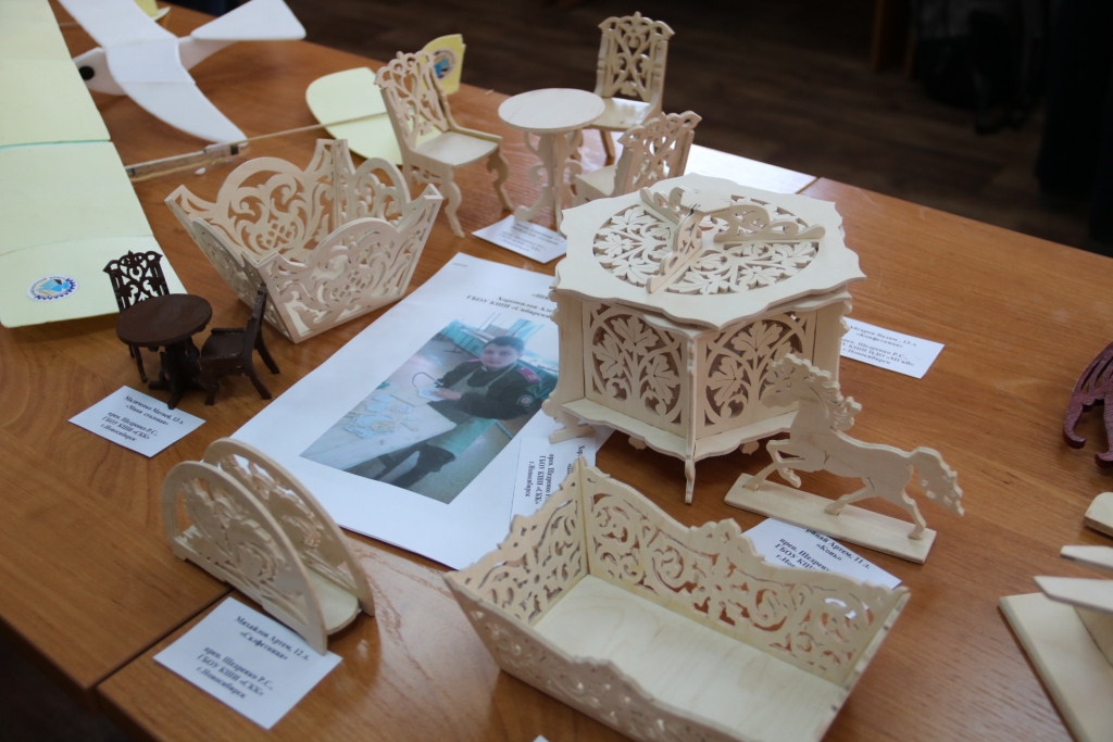 На выставке-конкурсе детского технического творчества посетители восхищенно рассматривали ажурные работы, выполненные с помощью лобзика, резьбы по дереву.