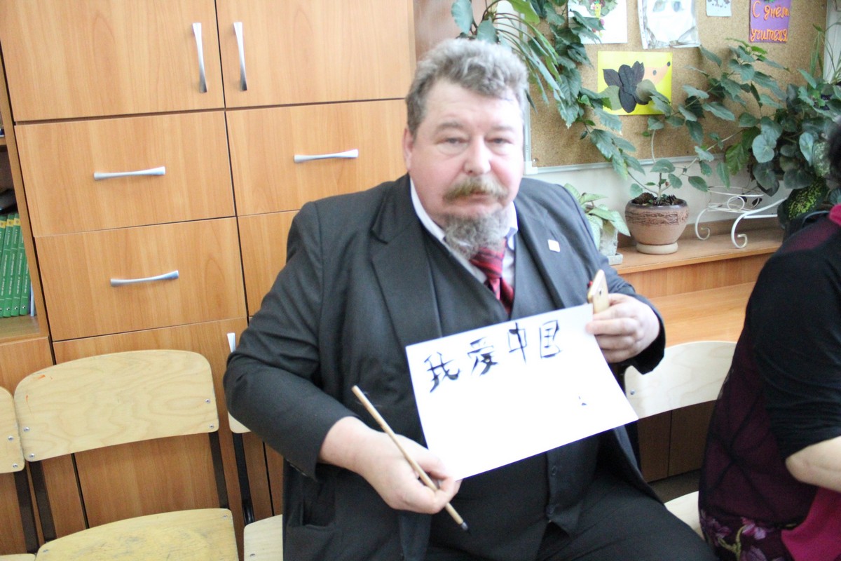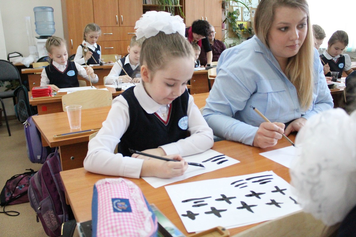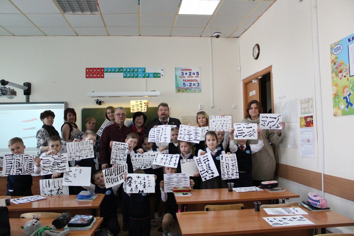 На фото: Профессор Синьцзяньского университета Ван Линь вместе с учителями китайского языка школы № 112 и педагогами центра изучения китайского языка и культуры Новосибирского Государственного Университета проводят открытый урок по китайской каллиграфии в 1 «А» классе.