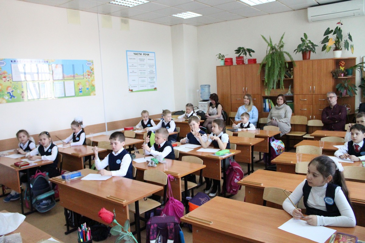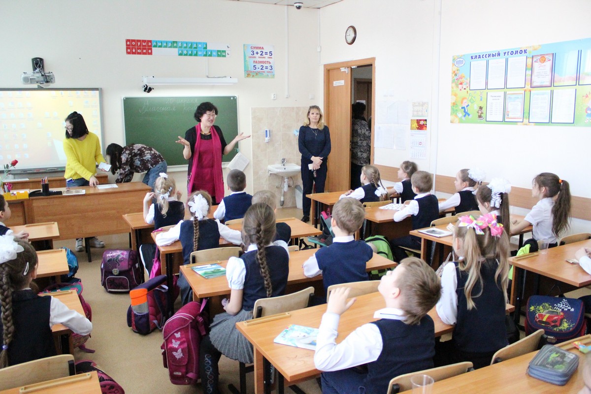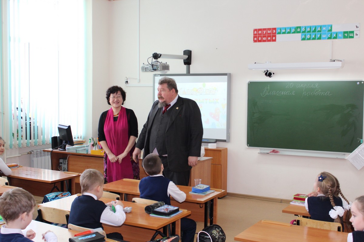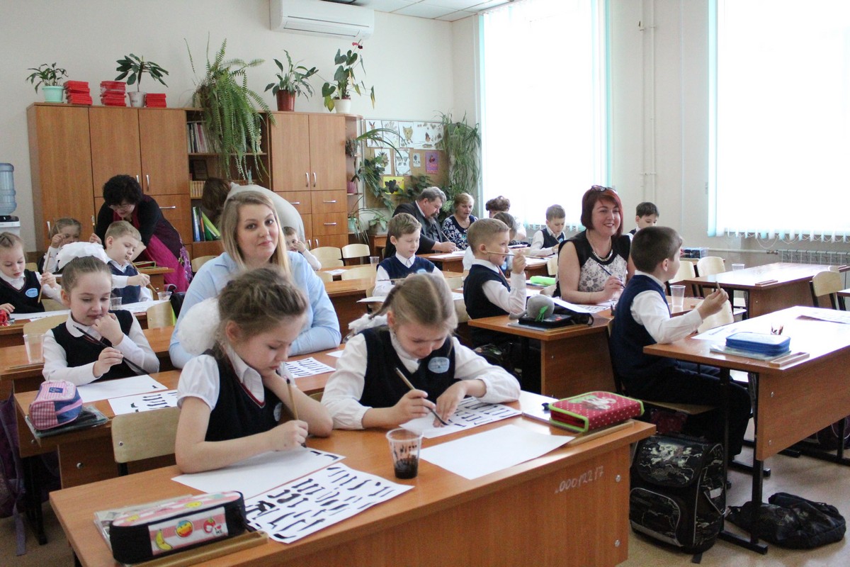 На фото: Профессор Синьцзяньского университета Ван Линь вместе с учителями китайского языка школы № 112 и педагогами центра изучения китайского языка и культуры Новосибирского Государственного Университета проводят открытый урок по китайской каллиграфии в 1 «А» классе.
