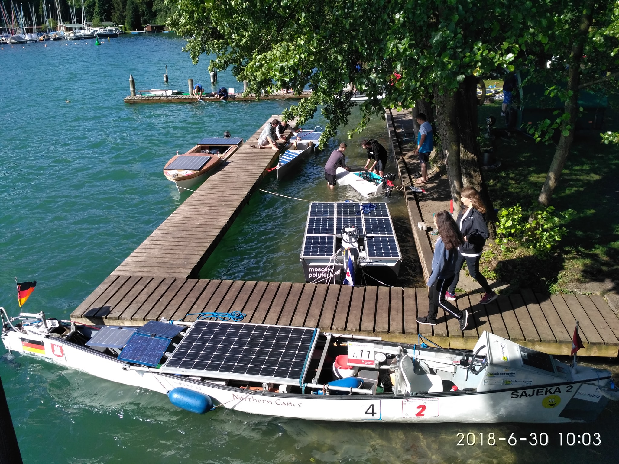 Итогом реализации первого этапа проекта «Солнечная регата» явилось участие команды «ПИЛОТ» детского технопарка школы № 112 города Новосибирска в Европейском чемпионате «солнечных лодок» (инженерные соревнования «Solarbootregatta» на озере Вербеллин в Германии) с 28 июня по 2 июля 2018 года. Участниками гонок стали 18 команд из технических университетов и старших школ Европейских стран, в том числе 6 российских команд – победителей и призеров Всероссийских инженерных соревнований «Солнечная регата 2018». Заезды проходили в нескольких категориях и состояли из двух частей: спринт и слалом, гонка на выносливость (3 часа).