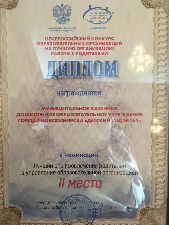 Педагогический коллектив МКДОУ д/с № 165 – призёр Всероссийского конкурса образовательных организаций на лучшую организацию работы с родителями