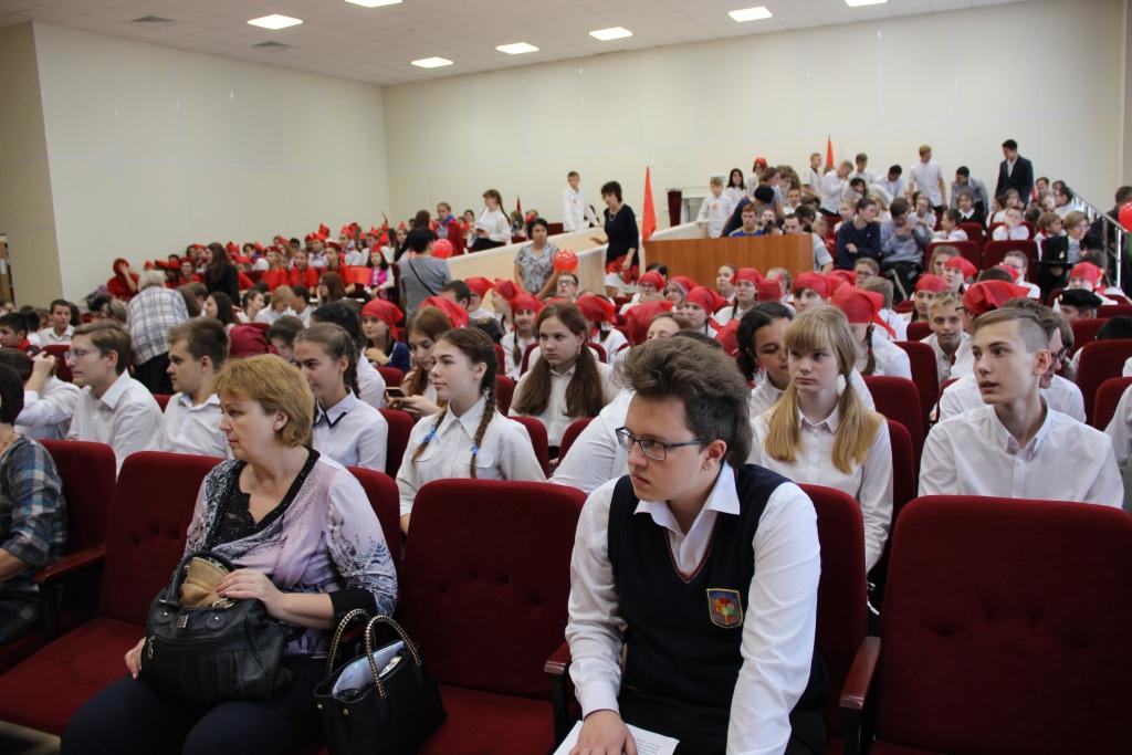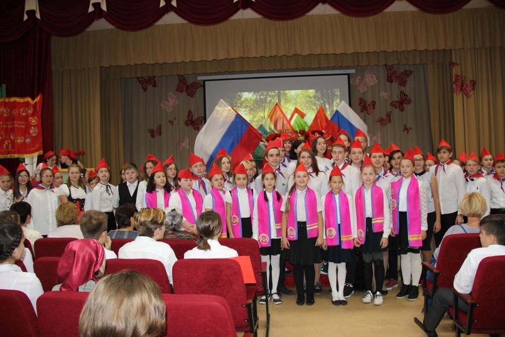 11 октября переполненный школьниками Калининского района актовый зал МБОУ СОШ № 23 алел от красных пилоток, косынок, галстуков, флагов. А как же иначе? В районе – фестиваль «Пусть песни расскажут, какими мы были», посвящённый 100-летию ВЛКСМ, организованный Центром детского творчества «Содружество» и непосредственно педагогом-организатором Центра Анфисой Николаевной Балакиной. Первые помощники – отряд вожатых «Океан улыбок».