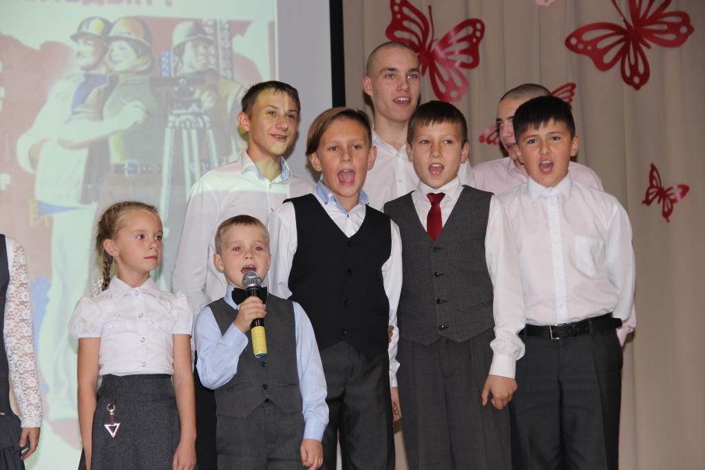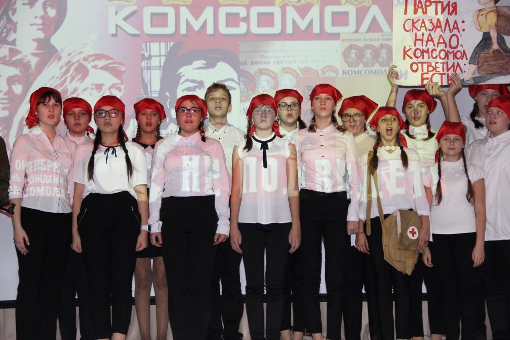 Это в фойе, а в зале – более 350 школьников, представляющих комсомольские песни на сцене. От песни к песне, звучавших на фестивале, оживала история комсомола, история Страны Советов – история Родины. «Дан приказ ему на Запад…», и «громыхает гражданская война». «Священная война», и «навеки умолкли весёлые хлопцы, в живых я остался один». «Комсомольцы-добровольцы», и «вновь продолжается бой!». «В буднях великих строек…», «и звонкой песнею пускай прославятся среди героев наши имена!»