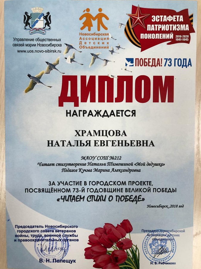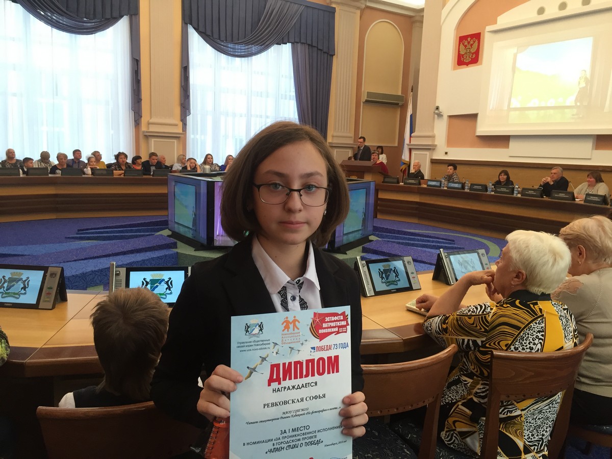 15 октября в большом зале мэрии города Новосибирска были награждены учащиеся МАОУ СОШ № 212 – участники проекта «Читаем стихи о Победе».