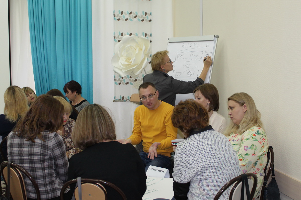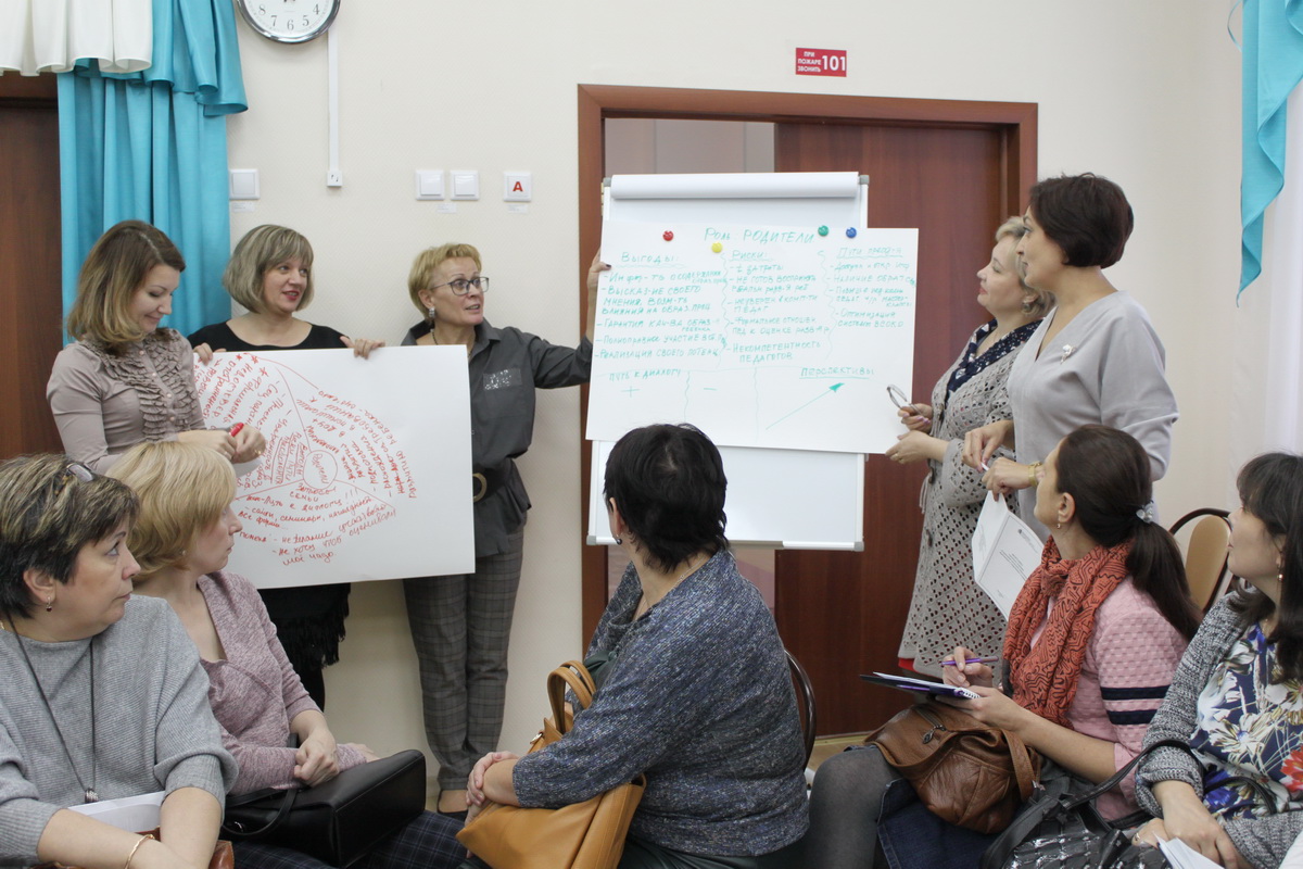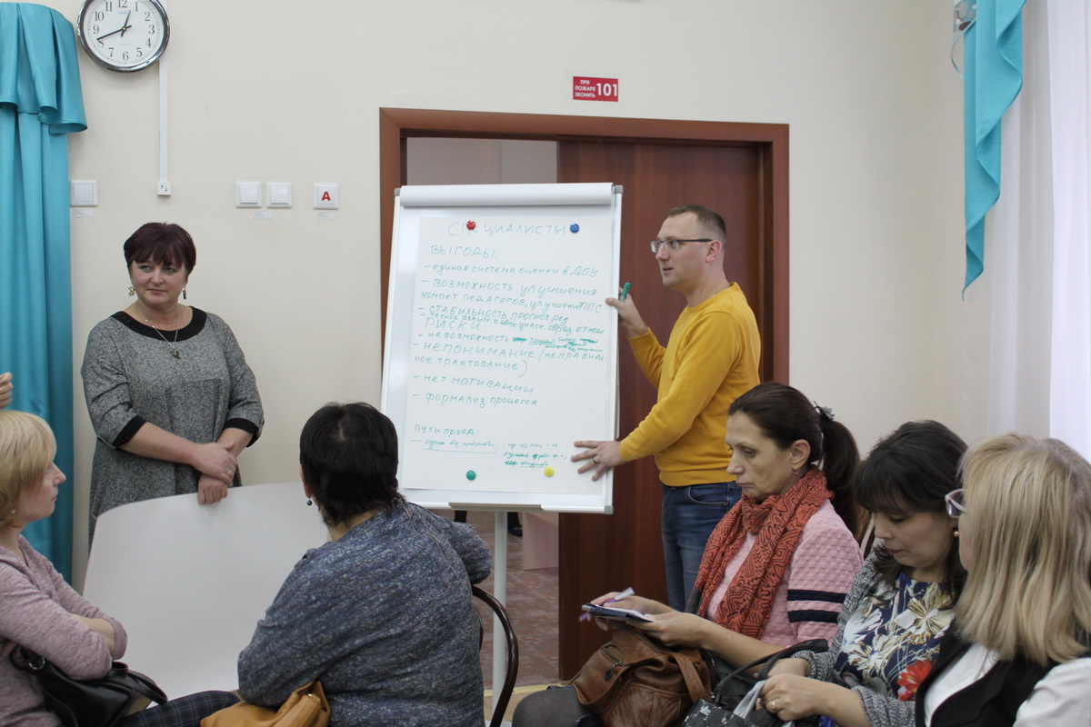 После небольшого перерыва участники семинара приступили к работе во второй, практической части семинара, которую провела Оберемок Светлана Михайловна, старший преподаватель кафедры управления образовательными учреждениями ГАУ ДПО НСО НИПКиПРО. В ходе подгрупповой работы участники семинара описывали выгоды, риски внедрения в практику ДОО внутренней системы оценки качества. Несмотря на то, что в законе дается четкое понятие о том, что такое качество образования, для каждого участника (дети, родители, педагоги, руководители) образовательных отношений в детском саду качество дошкольного образования имеет индивидуальную характеристику.