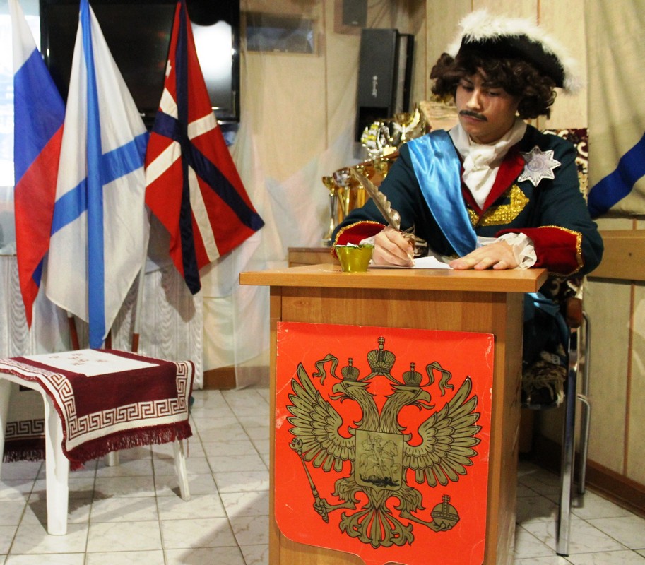 Первая часть мероприятия представляла собой спектакль, где старшие курсанты в образах Петра Великого, Александра Меншикова, Франца Лефорта и других личностей отчетливо показали историческую картину того времени: предпосылки и условия создания флота, дальнейшее его развитие. Руководители клубов юных моряков также принимали участие в качестве «Боярской думы». Спектакль получился ярким и нарядным, а мастерство актеров поразило до глубины души каждого зрителя!