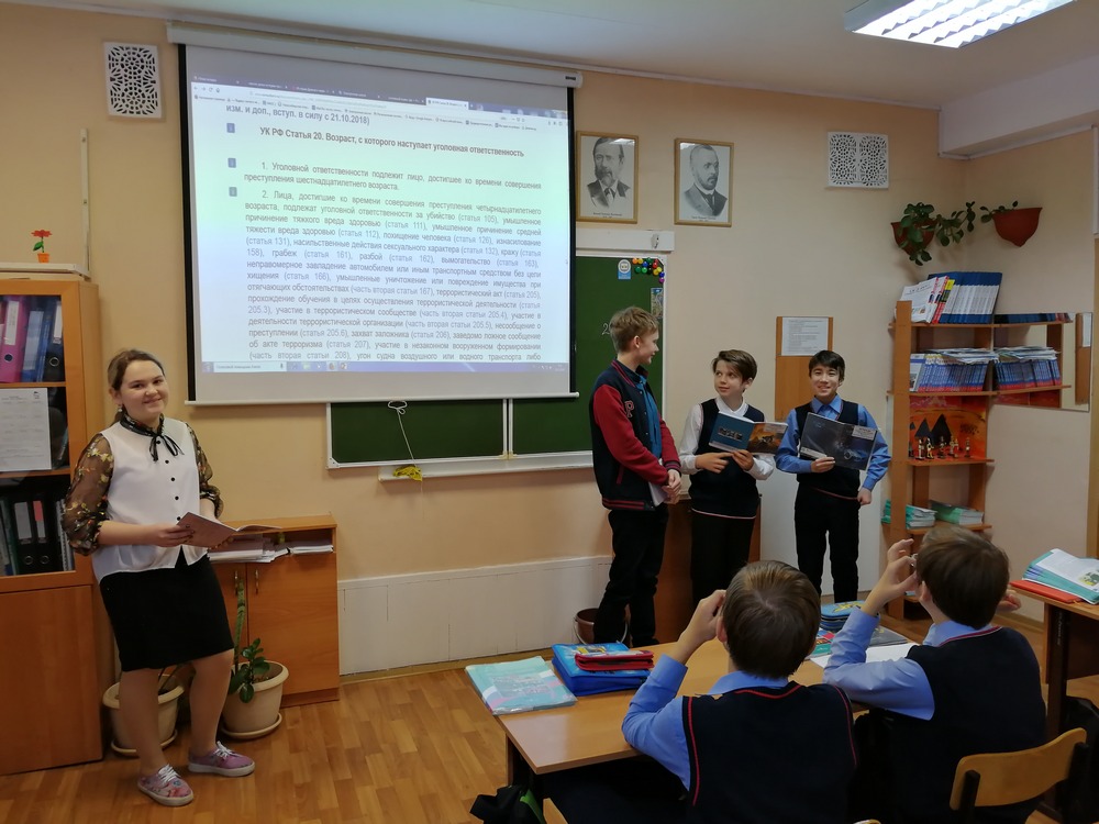 20 ноября обучающиеся 7 «Б» класса в рамках диспута высказывали мнение о причинах непонимания 14-летними подростками рамок юридической ответственности несовершеннолетних, сущности тех преступлений, за которые они могут быть привлечены к уголовной ответственности. Ребята пытались объяснить одноклассникам противоправность действий, попадающих под данные статьи Уголовного кодекса РФ. Ребята говорили о том, что школьник, недавно получивший паспорт, раскрасивший объект историко-культурного наследия в стиле граффити, не должен объяснять данный акт вандализма как проявление творчества и желание сделать мир ярче. Участие в массовых беспорядках недопустимо толковать как проявление коллективизма и солидарности, а изготовление взрывчатых веществ – это не невинные лабораторные опыты юного химика. В 6-х классах в этот день был проведен конкурс «Права несовершеннолетних». Обучающиеся познакомились с правами ребёнка, с защитой прав детей, с законами РФ, где закреплены основные положения, с «Конвенцией о правах ребёнка».