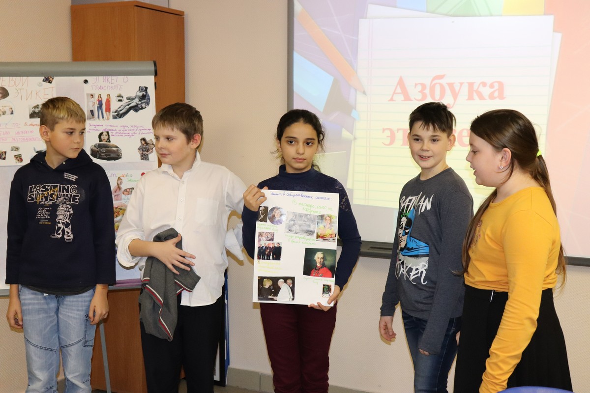 Ученики 3 «Б» и 4 «В» классов СОШ № 58 познакомились с понятием «этикет», узнали много интересного о таких видах этикета, как речевой, столовый, этикет в общественных местах и в общественном транспорте. Ребята продемонстрировали отличное знание правил поведения в обществе и, объединившись в команды, создали коллаж «Азбука этикета». На этапе презентации коллажей и инсценировки правил поведения мальчишки и девчонки не только проявили свои творческие способности и умение договариваться, но и посмеялись от души!
