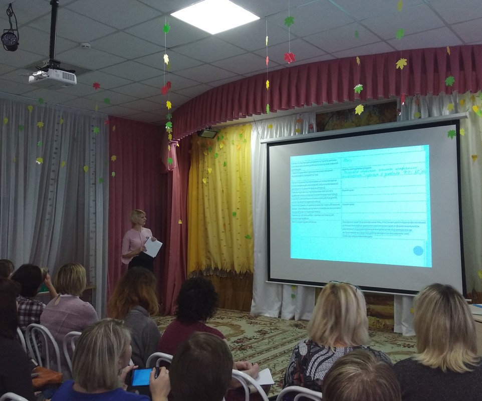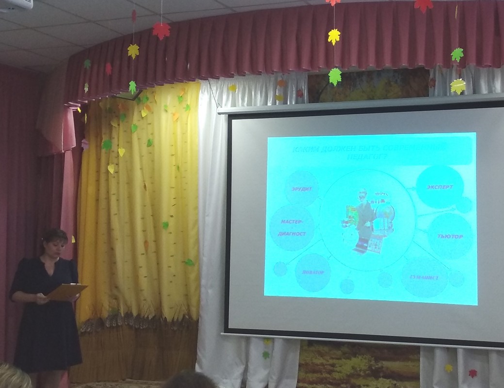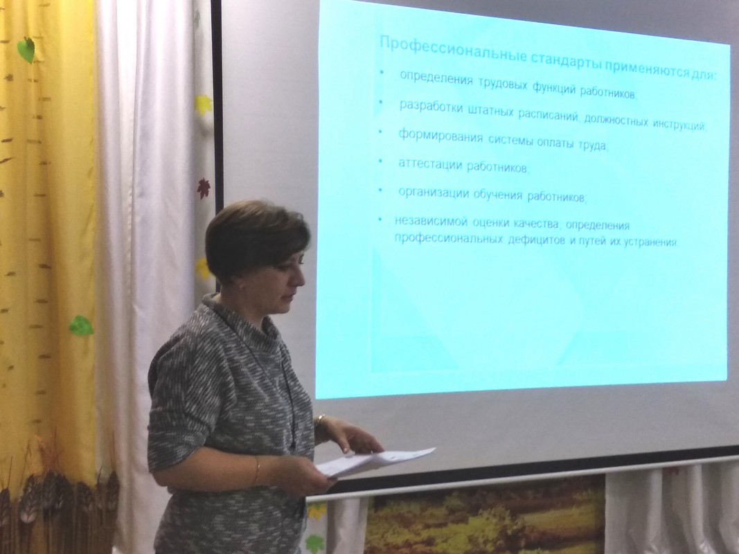 Чечулина Оксана Геннадьевна представила педагогам презентацию «Методическое сопровождение применения профессионального стандарта в ДОО». В своём выступлении Оксана Геннадьевна отметила необходимость применения профессиональных стандартов: актуализация квалификационных характеристик видов профессиональной деятельности, реализуемых в экономике страны, создание объективной основы для формирования программ профессионального образования/обучения/подготовки, актуализация перечня должностей/профессий. Профессиональные стандарты применяются для: определения трудовых функций работников; разработки штатных расписаний, должностных инструкций; формирования системы оплаты труда; аттестации работников; организации обучения работников; независимой оценки качества, определения профессиональных дефицитов и путей их устранения. Профессиональный стандарт будет применяться в качестве: независимого измерителя уровня квалификации педагогических работников; средства реализации стратегии развития образовательной среды; инструмента роста качества российского образования; фундаментальной основы трудовых соглашений между руководством образовательного учреждения и педагогами; механизма приёма педагогических кадров для работы в образовательных организациях. Методическое сопровождение введения профессионального стандарта включает: изучение нормативных документов и методических материалов; разработку пакета нормативно-правовых документов, необходимых для использования стандарта в деятельности ДОУ; организацию оценки и самооценки соответствия компетенций педагога содержанию трудовых функций профстандарта; типологизацию выявленных проблем, разработку и реализацию программ методического сопровождения коллектива и отдельных педагогов.