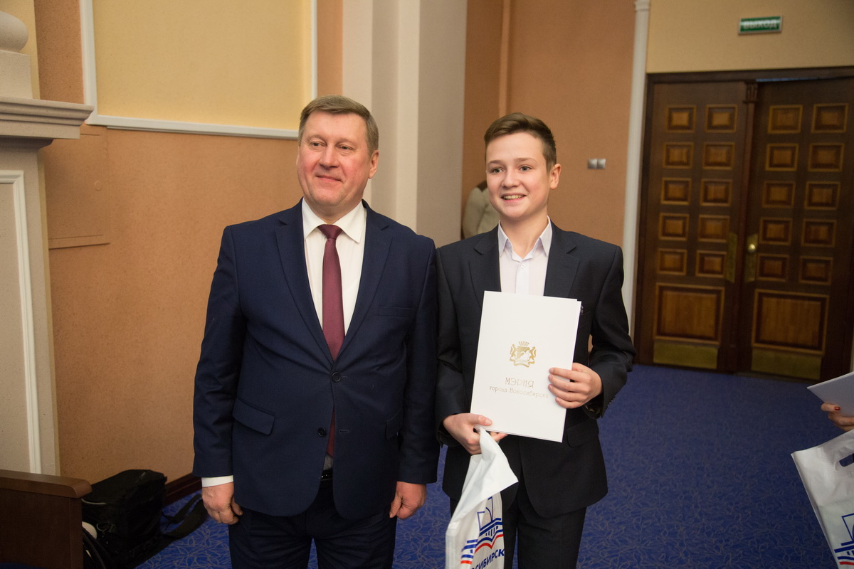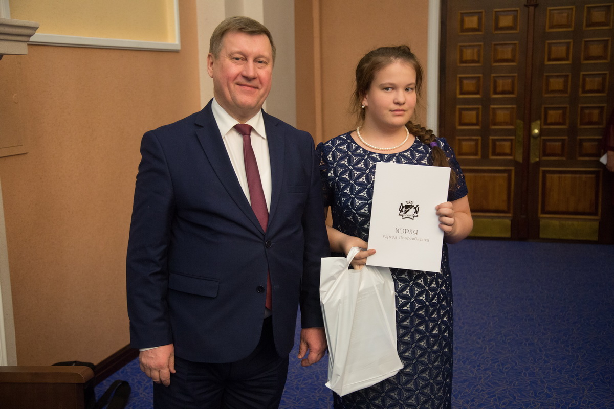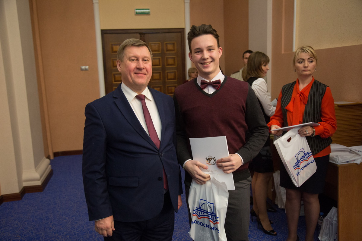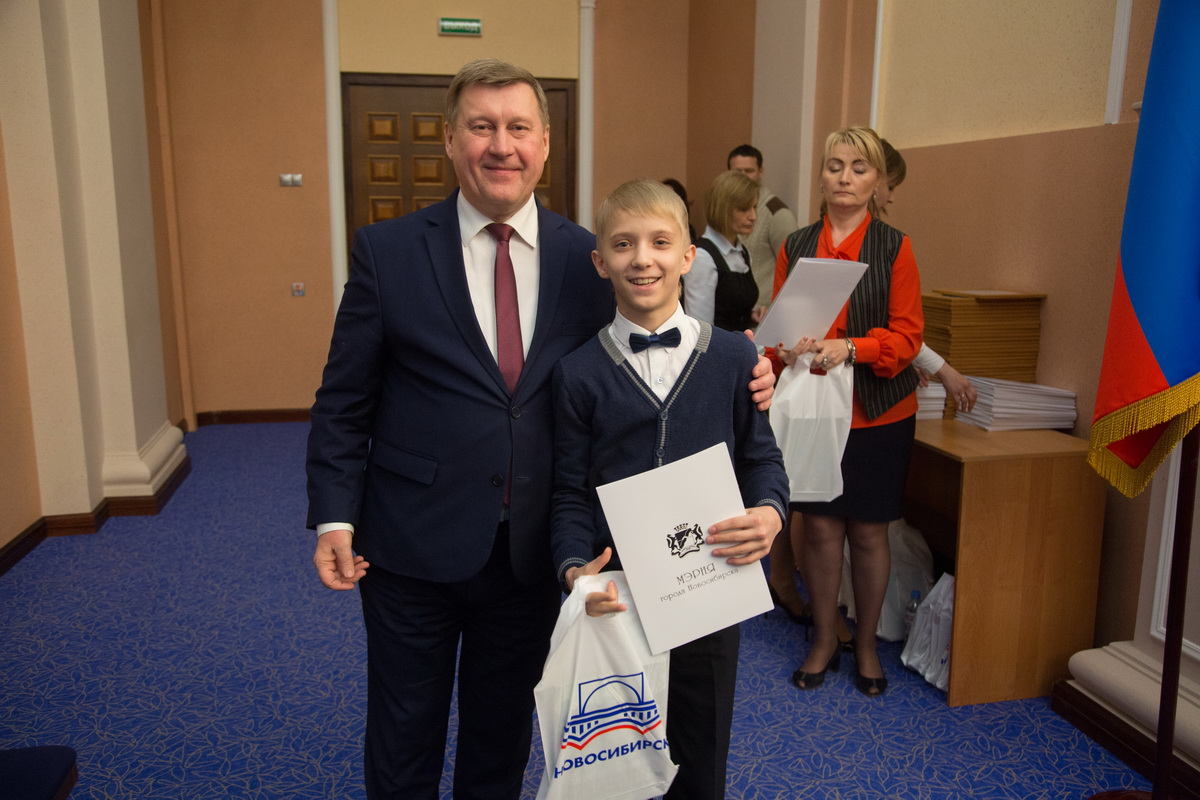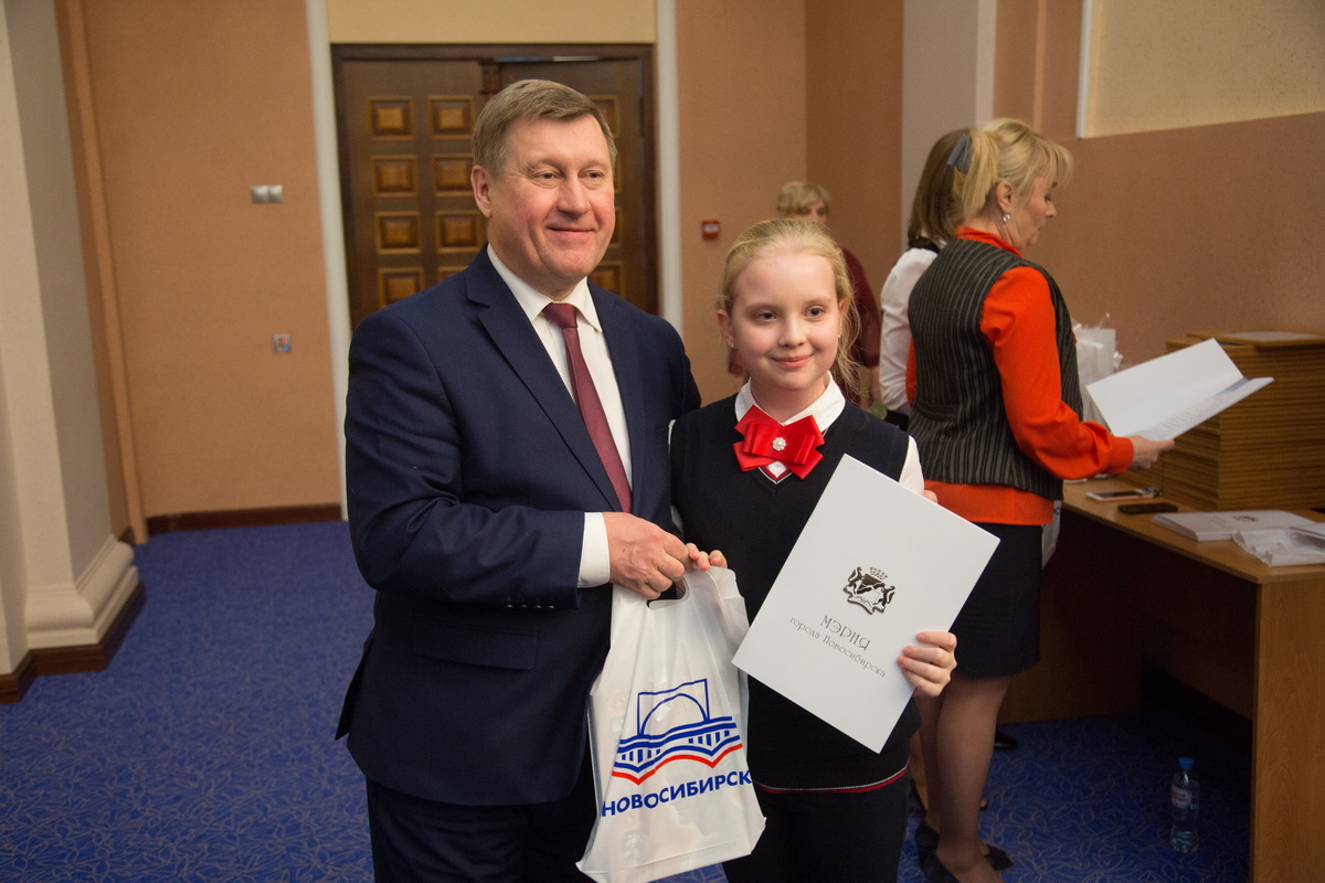 Мэр Новосибирска Анатолий Евгеньевич Локоть встретился с юными дарованиями – победителями и призерами международных и всероссийских творческих, технических, спортивных фестивалей, конкурсов и соревнований. Торжественный прием прошел 27 декабря в большом зале мэрии.