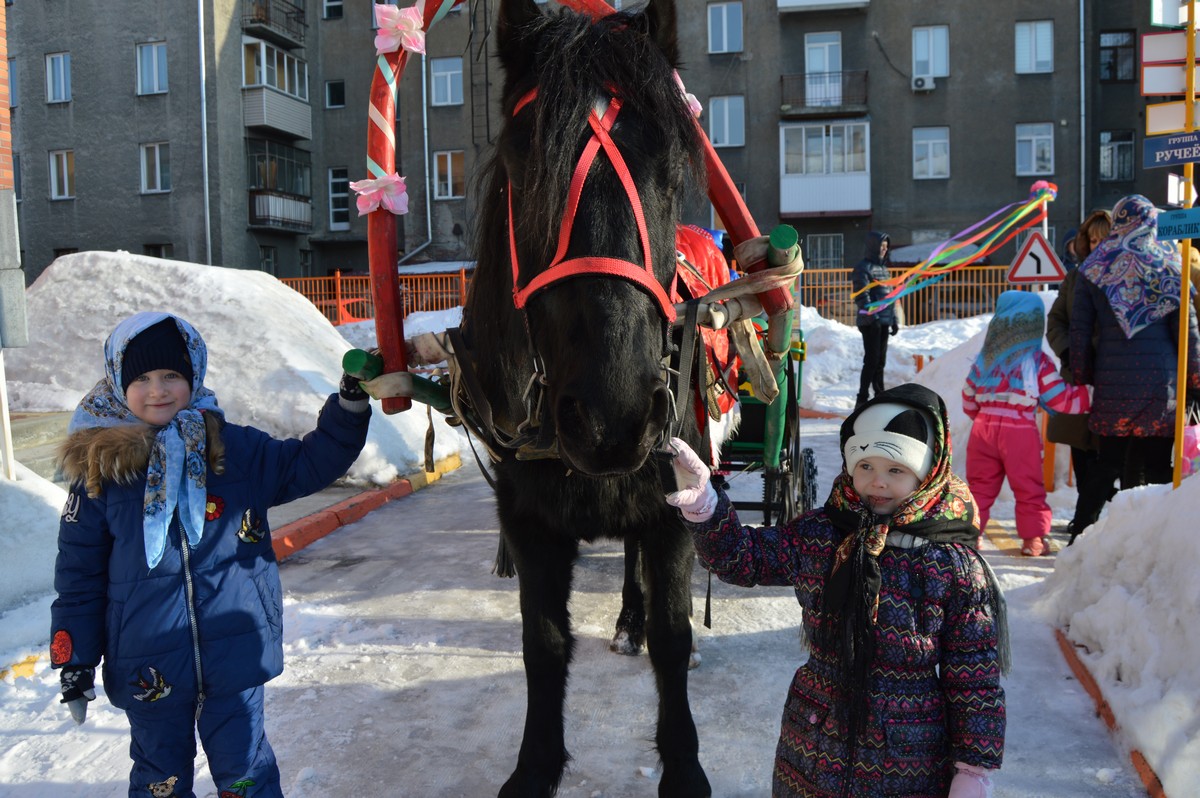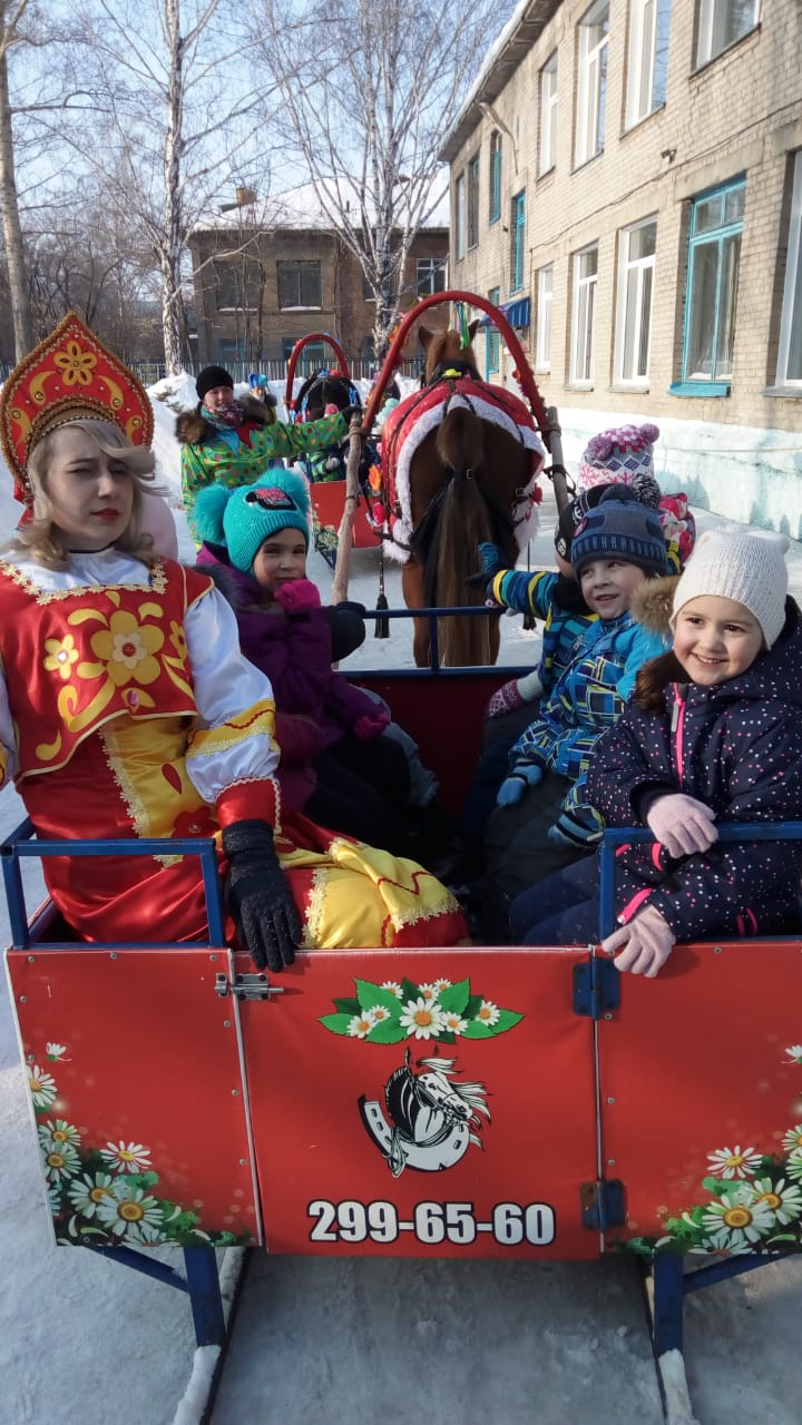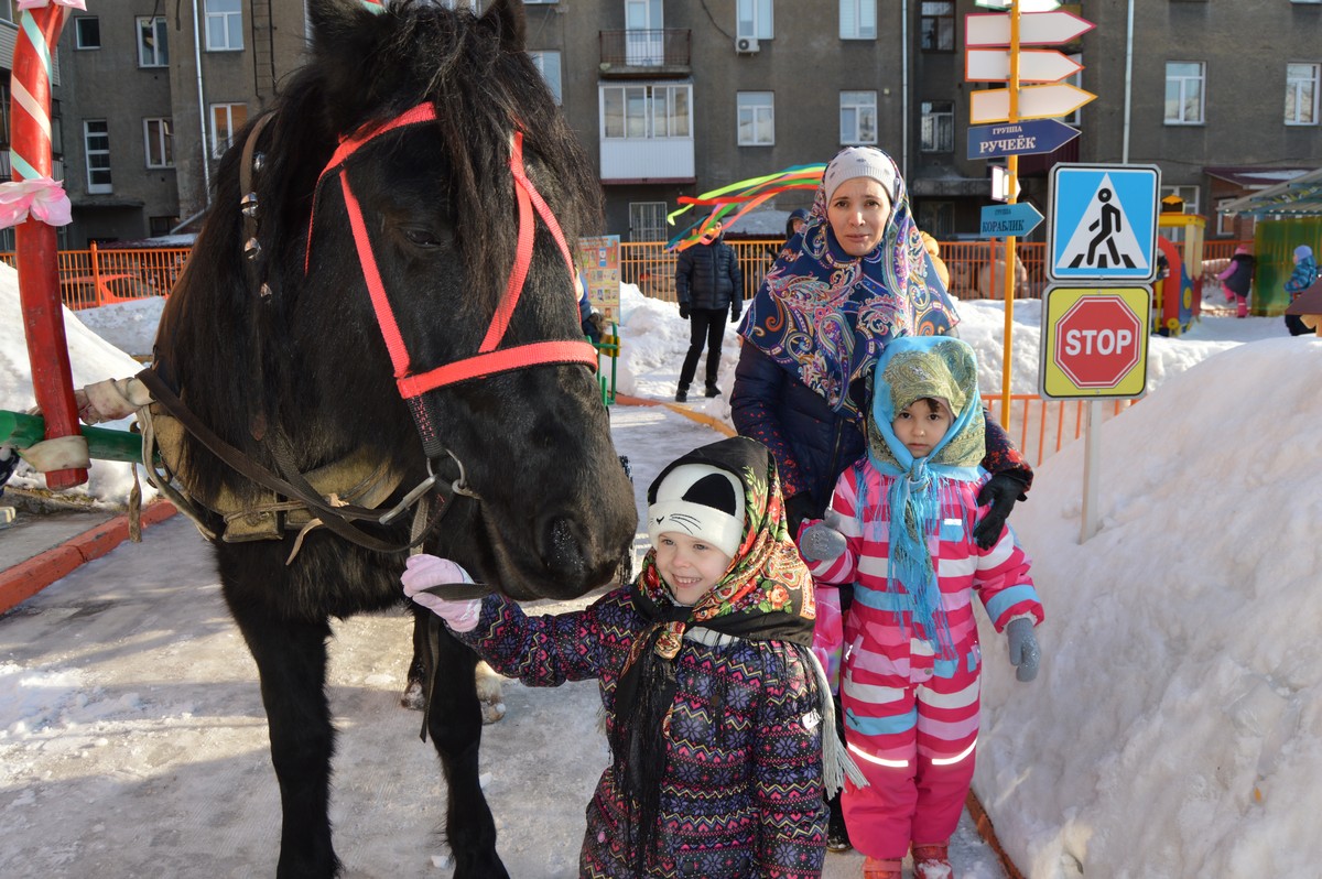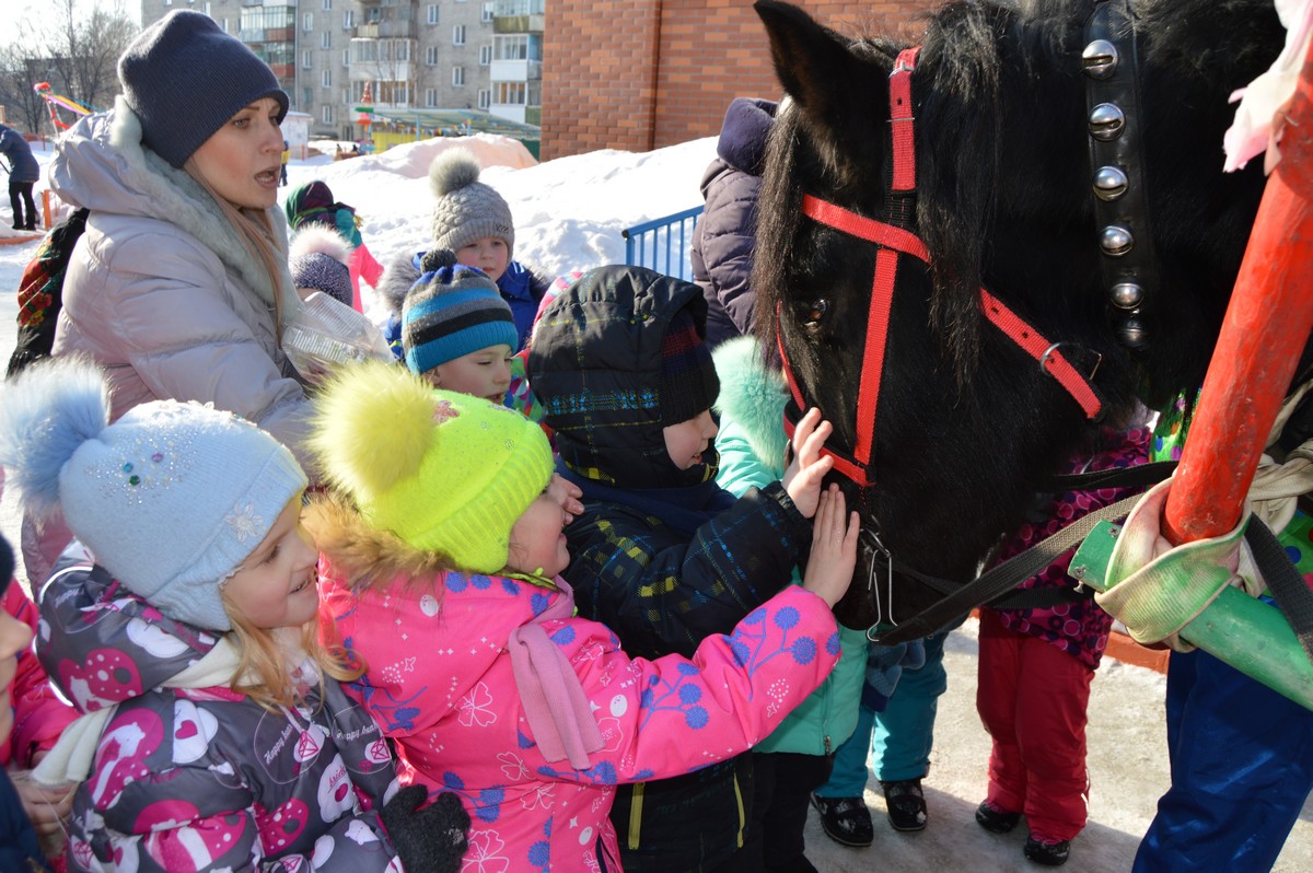 По традиции праздник начинается в зале, куда детей всех групп зазывает веселый Скоморох: веселые игры, загадки, пляски. Потом веселье плавно выплёскивается на улицу! И вот здесь-то приходит Зима с пляской «А на улице мороз», подвижными играми, закличками; появляется Весна. Зима передает ей бразды правления. А дальше самое любимое детворой: вкусные блины и катание на лошади! А когда старшим детям разрешили покормить лошадку – восторгу не было предела!
