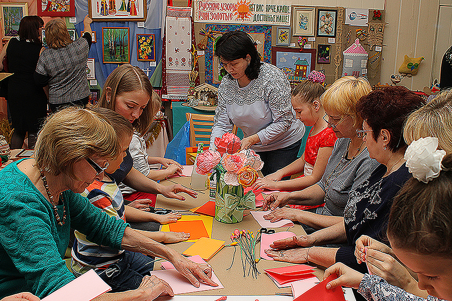 С 12.00 до 13.00 в рамках выставки прошел авторский мастер-класс по лепке из жатой бумаги. Педагог дизайн-студии «Веснушка» Галина Александровна Исаева вместе с детьми и их родителями создали целый букет красивых бумажных роз.