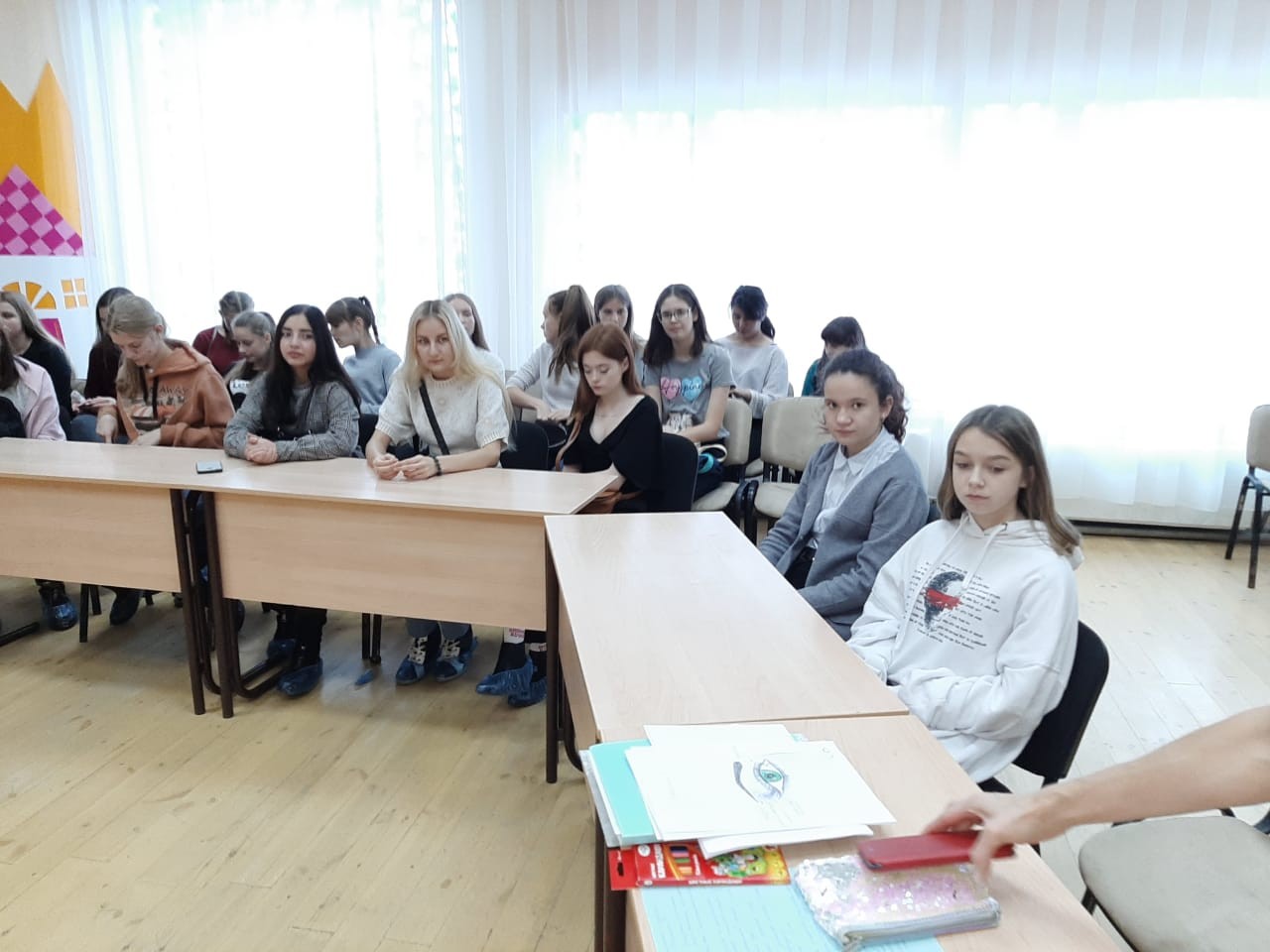 Мастер-класс «Сам себе визажист» собрал в актовом зале девушек 12–18 лет.