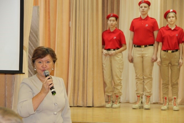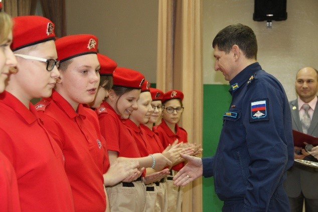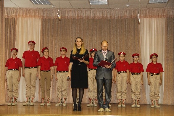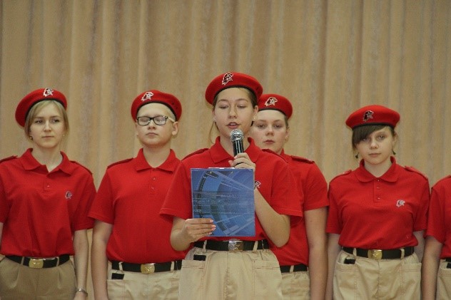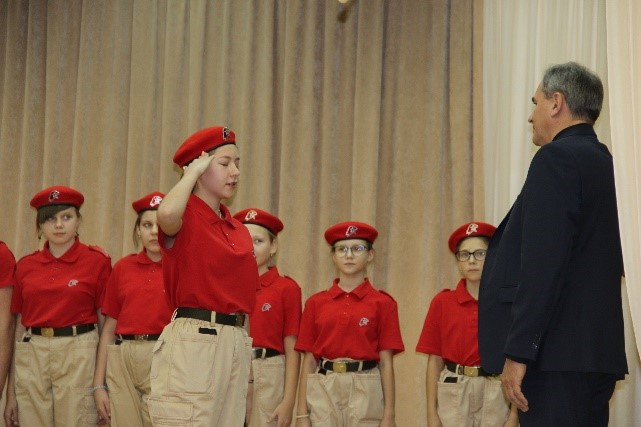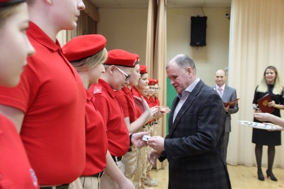 С приветственным словом к участникам праздника обратился начальник штаба местного отделения ВВПОД «Юнармия» Васильев Игорь Геннадьевич, отметив, что «Юнармия» для мальчишек и девчонок – это школа будущего, где воспитывается настоящий характер, смелость, целеустремленность и воля к победе. Затем учащиеся произнесли слова торжественной клятвы, и почётные гости вручили ребятам знаки принадлежности к общественно-патриотическому движению «Юнармия».