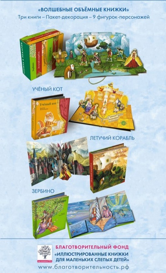 Книги для особых читателей разработаны с помощью психологов и тифлопедагогов и позволяют слабовидящим детям стимулировать остаточное зрение. Их страницы выполнены из прочного картона, с вырубками, движущимися деталями и яркими крупными иллюстрациями. Применение выпуклого контура или барельефа дает возможность ребенку на ощупь определить форму изображенного объекта и почувствовать его детали и поверхность.