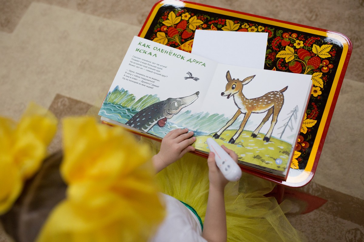 На страницах книг размещены микрокоды, и, если поднести к ним специальное устройство – «волшебный карандаш» – звучат стихи и музыка, разговаривают персонажи сказок. Благодаря этому, дети, которые еще не владеют шрифтом Брайля, могут понять, что написано в книге, – с помощью слуха, осязания и остаточного зрения.