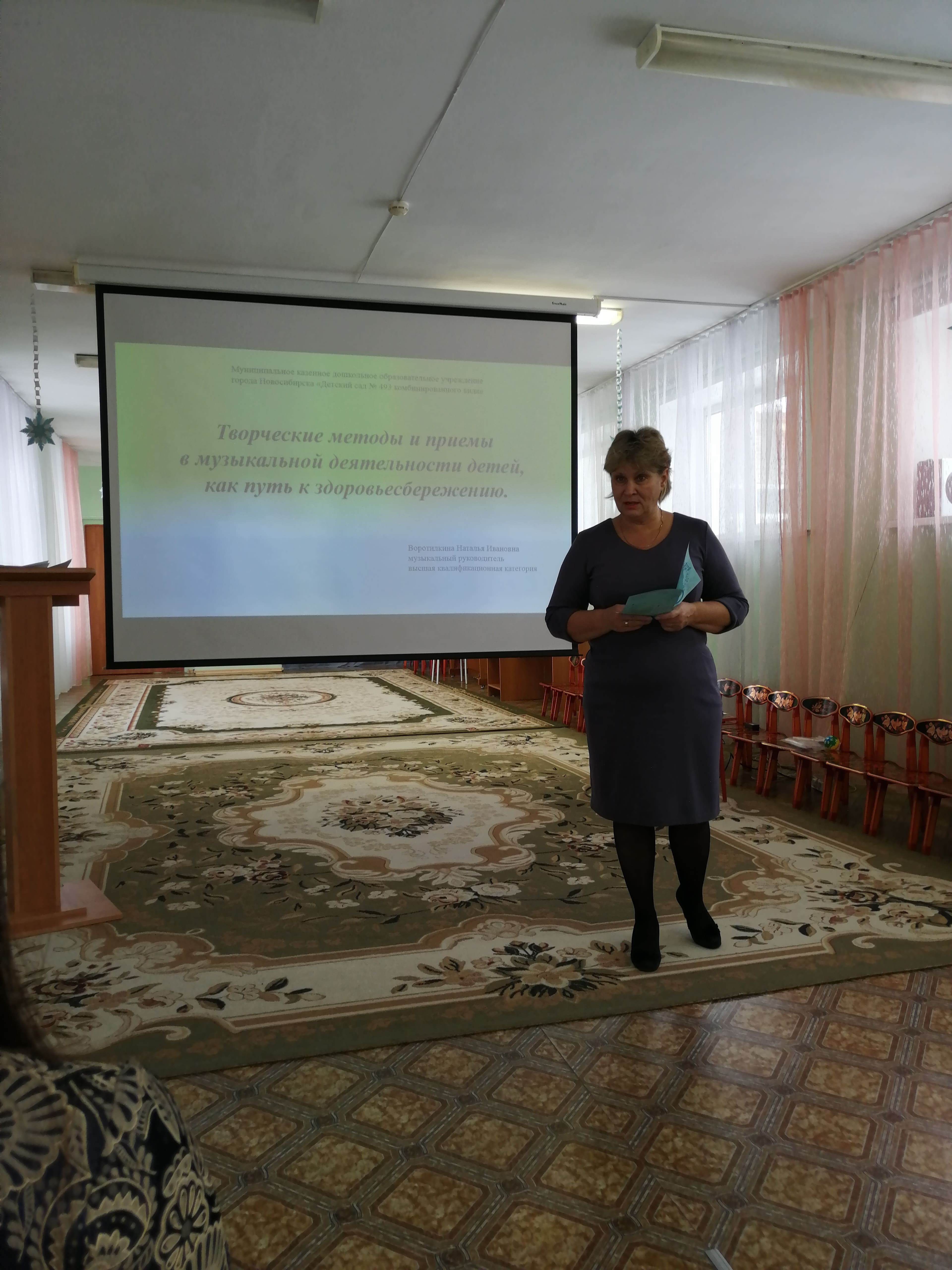 Большой интерес вызвало выступление и просмотры практических занятий музыкального руководителя МКДОУ № 493 высшей квалификационной категории Воротилкиной Натальи Ивановны. Она представила выступление «Творческие методы и приемы в музыкальной деятельности детей, как путь к здоровьесбережению». Вниманию участников мероприятия была представлена совместная деятельность музыкального руководителя и детей старшего дошкольного возраста – праздник «Осенины» (музыкальный руководитель Кабринюк Екатерина Владимировна).