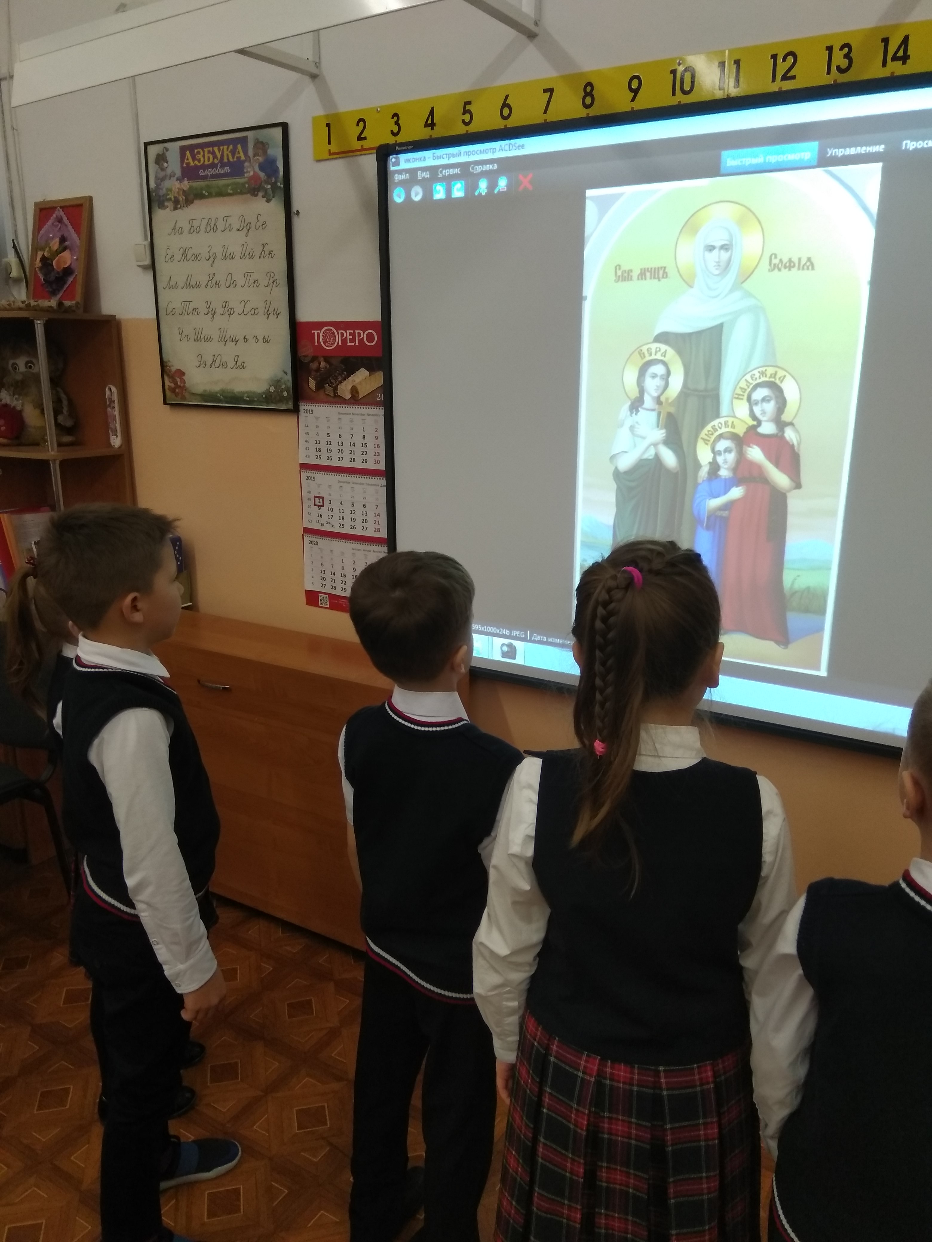 Целью данного занятия было приобщение обучающихся к духовно-нравственным ценностям; знакомство с жизнью святых Веры, Надежды, Любви и Софии; раскрытие традиций православных праздников, истории их возникновения и особенности празднования. С помощью медиаматериала – мультфильма «Вера, Надежда, Любовь и София» детям была представлена история жизни святых мучениц. А видеоклипы «Берегите любовь» и «Притча о четырех свечах» дали возможность говорить на доступном для первоклассников языке о главных христианских добродетелях. Ребята говорили о том, что именно любовь делает жизнь человека счастливой: «Любовь – это желание приносить радость, пользу и добро бескорыстно». И самая большая и взаимная любовь у детей – это любовь к маме.