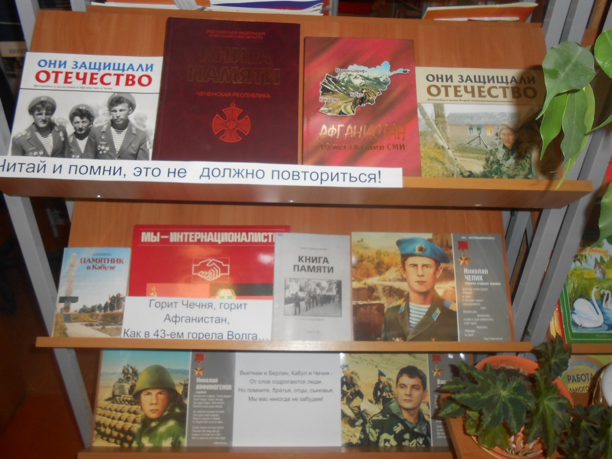 В библиотеке оформлена книжная выставка «Читай и помни, это не должно повториться!», проведены уроки-обзоры литературы о войне в Афганистане и Чечне, презентация Книг памяти.