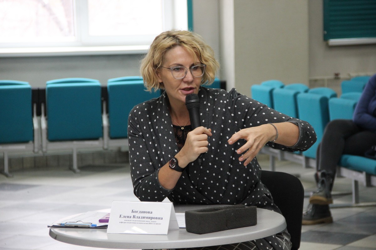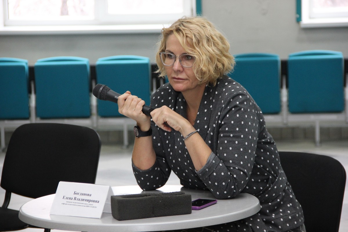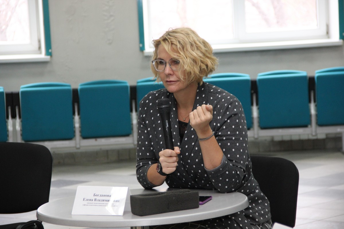 Модератором встречи выступила Елена Владимировна Богданова, канд. пед. наук, доцент кафедры психологии ИИГСО, заведующая кафедрой педагогики и психологии детского отдыха ФГБОУ ВО «НГПУ».