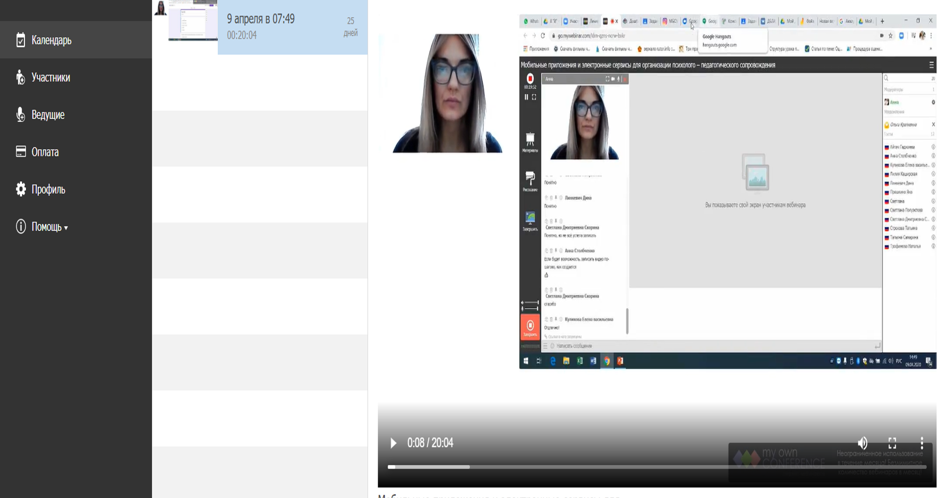 Для проведения развивающих занятий можно воспользоваться приложением Zoom. Настройки позволяют включить ограничения и обеспечить фильтрацию контента. Проводить уроки психологии можно на сайте cp.mywebinar.com. Организовав вебинар, педагог-психолог может управлять деятельностью обучающихся, встраивая в этот процесс различные медиафайлы, ссылки на сторонние ресурсы.