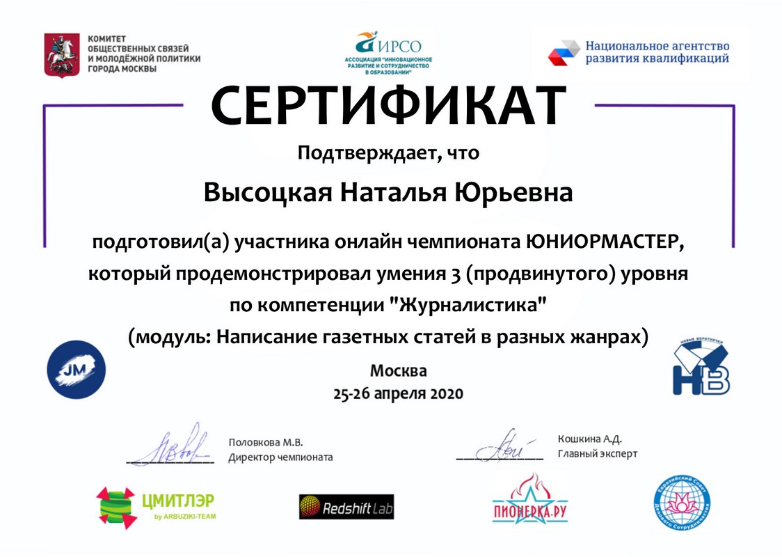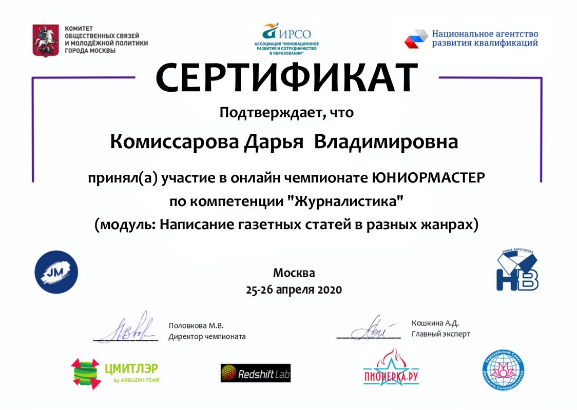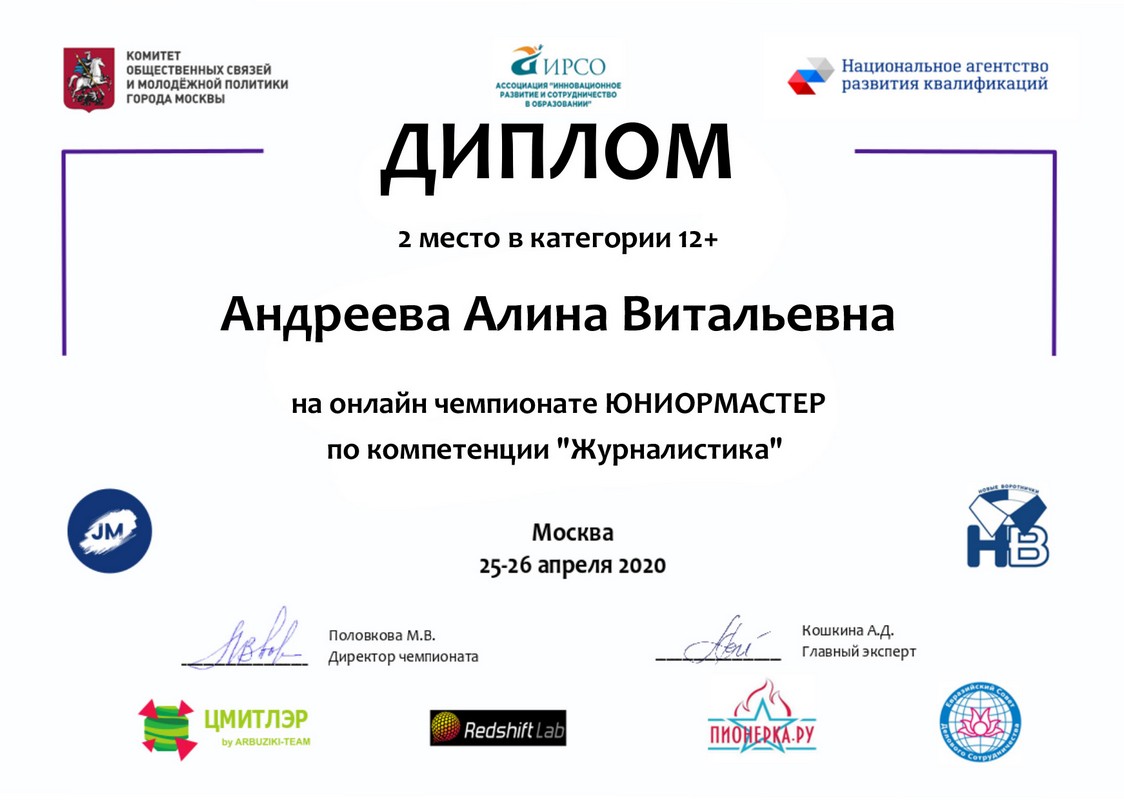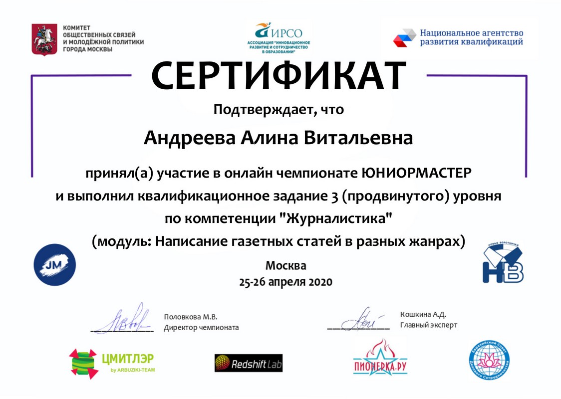 25 апреля в рамках проекта «Новые воротнички: в профессию будущего со школьной скамьи» состоялся первый Открытый сертификационный чемпионат «ЮниорМастер». В нем принимали участие ребята из разных городов нашей страны, в том числе участники творческого объединения «Юнкор» – Марина Кочергина, Артем Велигуров, Ольга Сидорова, Алина Андреева и Дарья Комиссарова. Все наши корреспонденты показали высокий уровень владения журналистскими навыками.