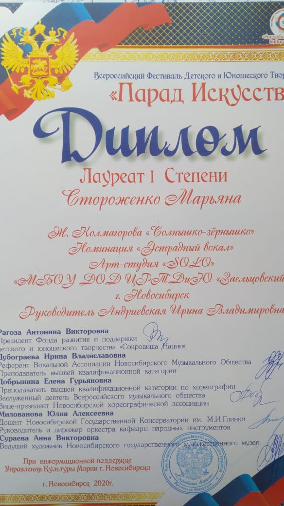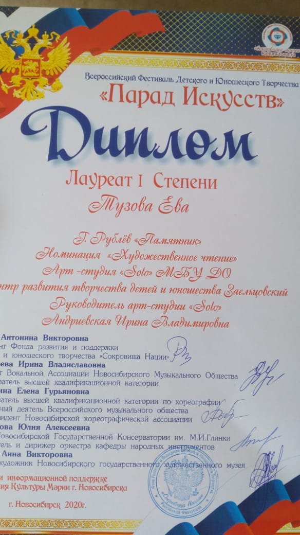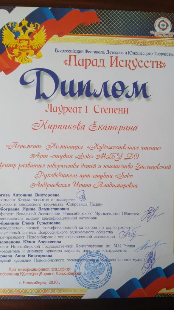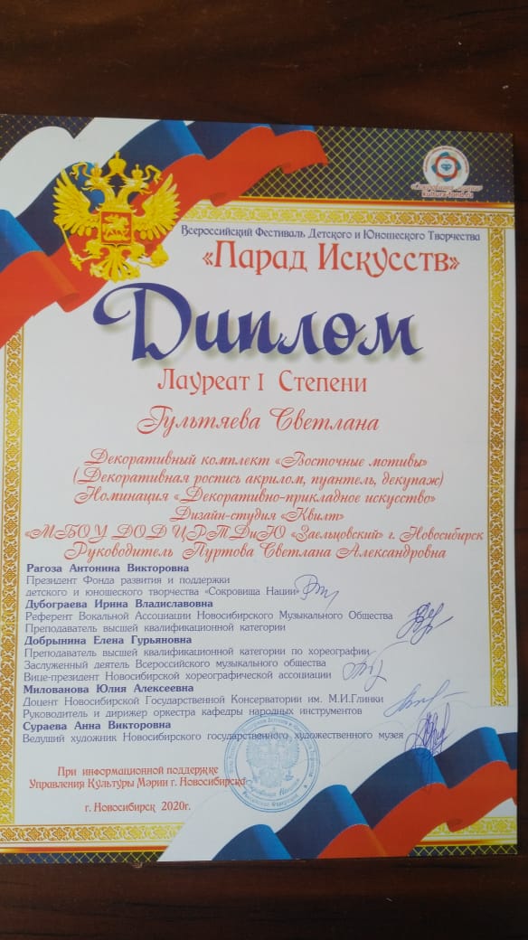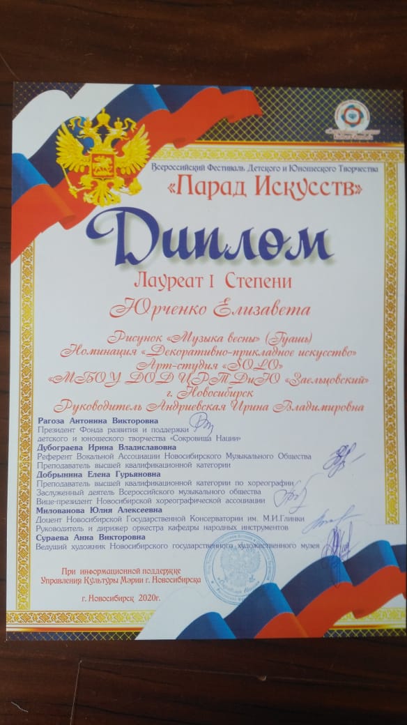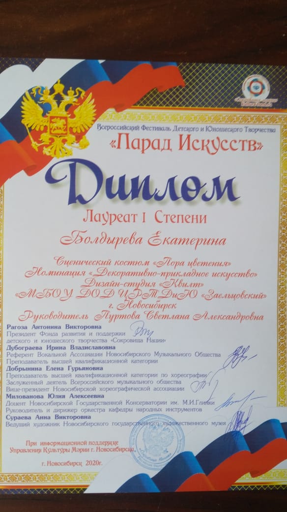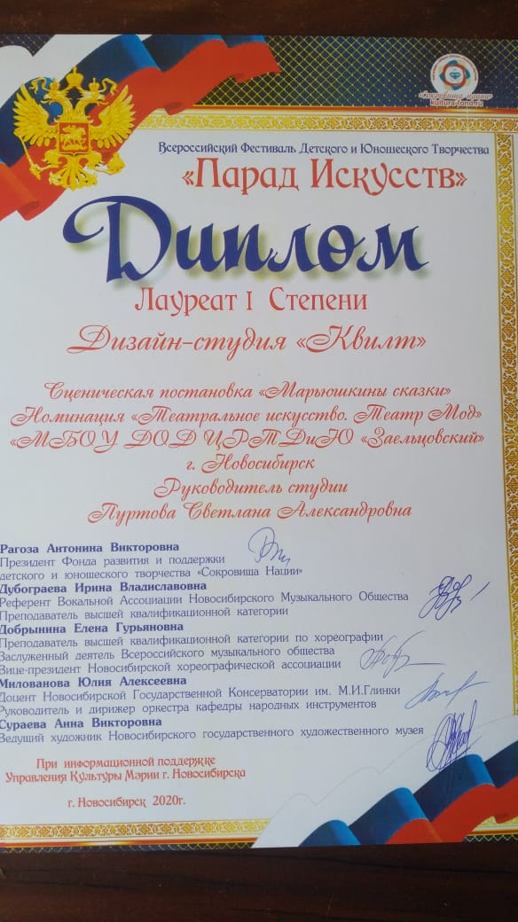 Образцовые коллективы ЦРТДиЮ «Заельцовский»: Арт-студия «Solo», руководитель Андриевская Ирина, и дизайн-студия «Квилт», руководитель Светлана Пуртова, ведут активную конкурсную деятельность даже в режиме самоизоляции. Мы поздравляем наших коллег и их воспитанников с заслуженными высокими наградами Всероссийского фестиваля детского и юношеского творчества «Парад искусств». Желаем творческих успехов и новых побед!