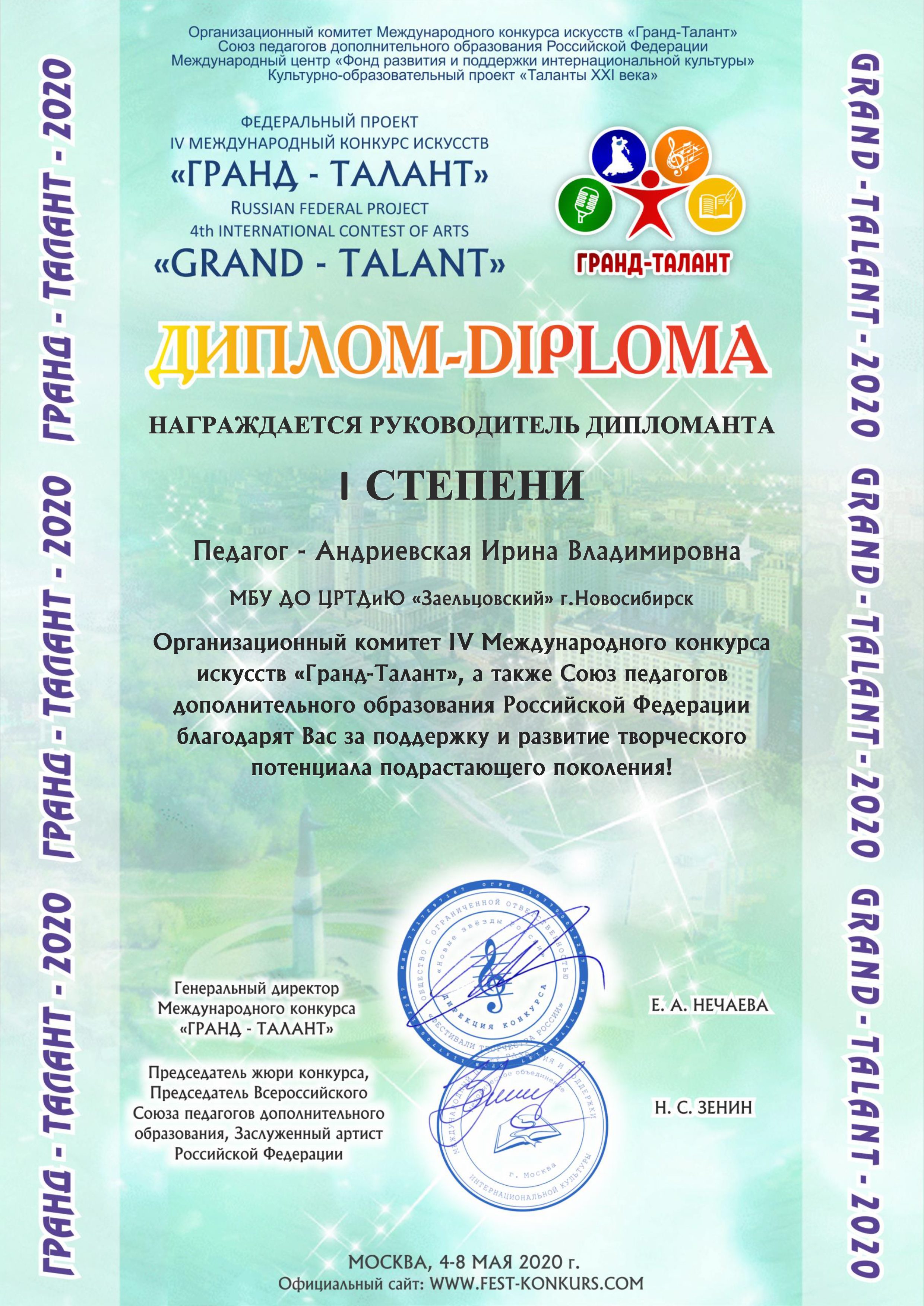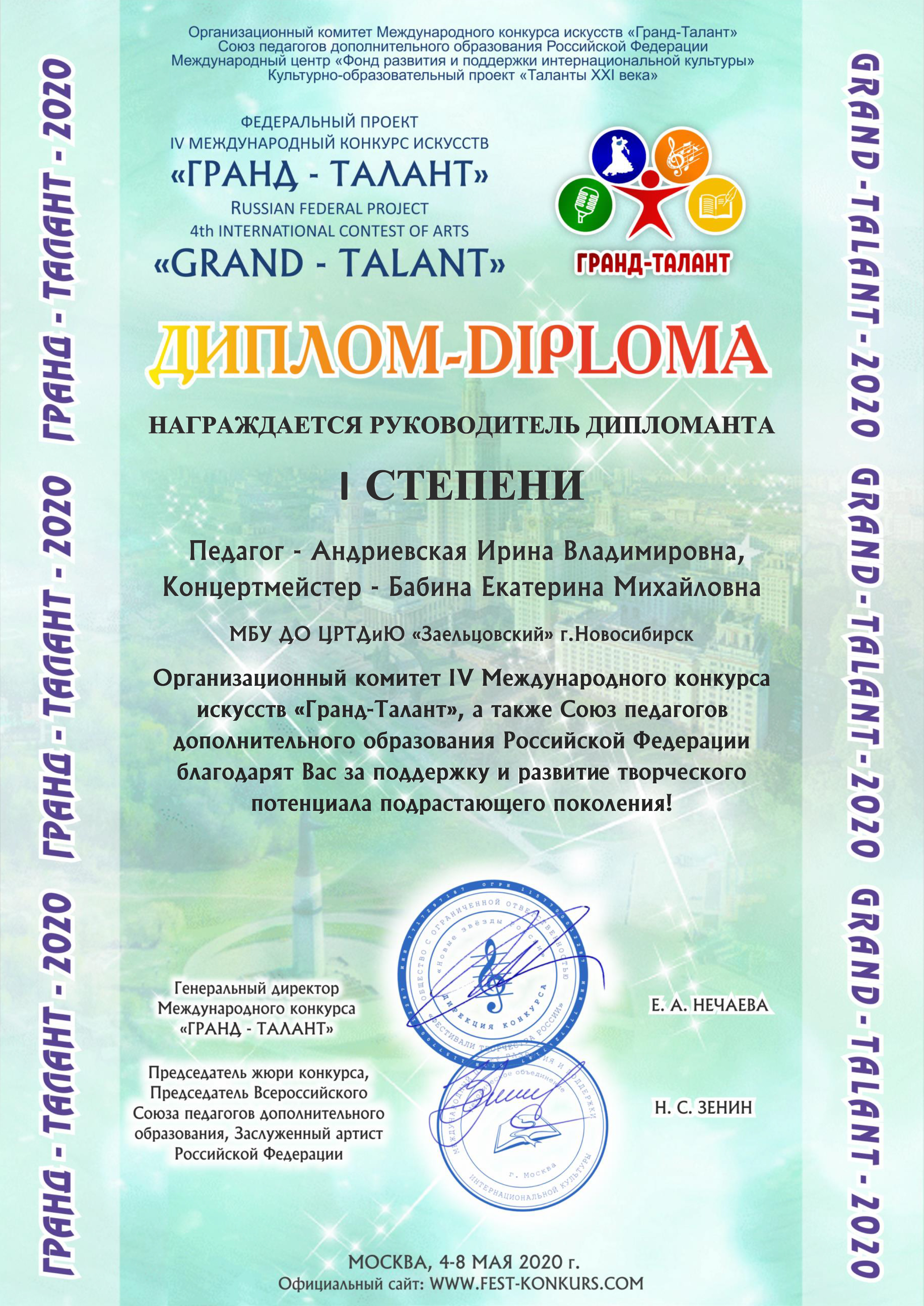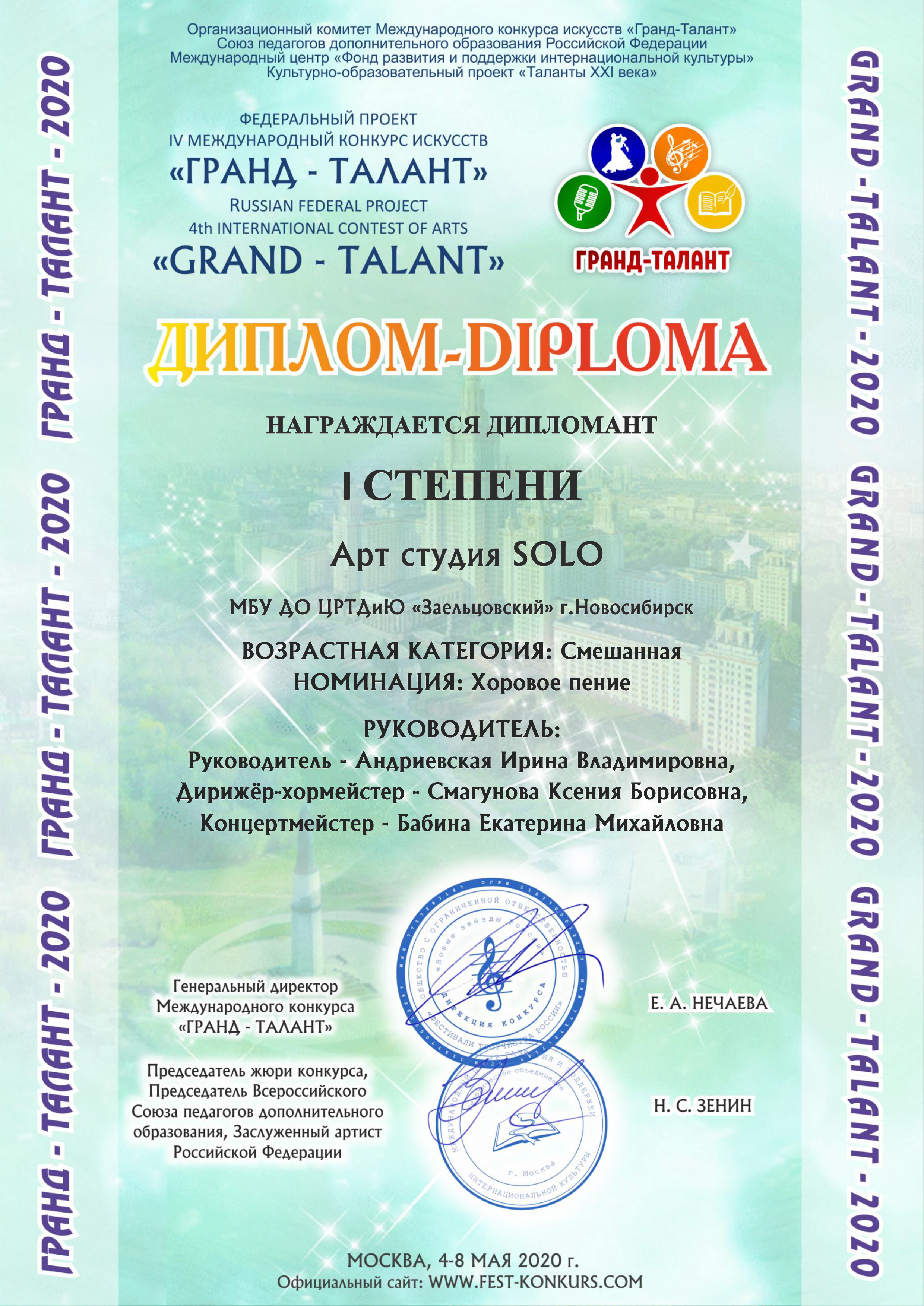 Май — это настоящий месяц побед для образцового коллектива Арт-студии «Solo» ЦРТДиЮ «Заельцовский». Студия приняла участие онлайн в Федеральном проекте IV международного конкурса искусств «Гранд-талант 2020», г. Москва, и получила не только высокую оценку своего творчества, но и благодарность оргкомитета фестиваля за поддержку и развитие подрастающего поколения! Мы гордимся и поздравляем наших коллег и их воспитанников!