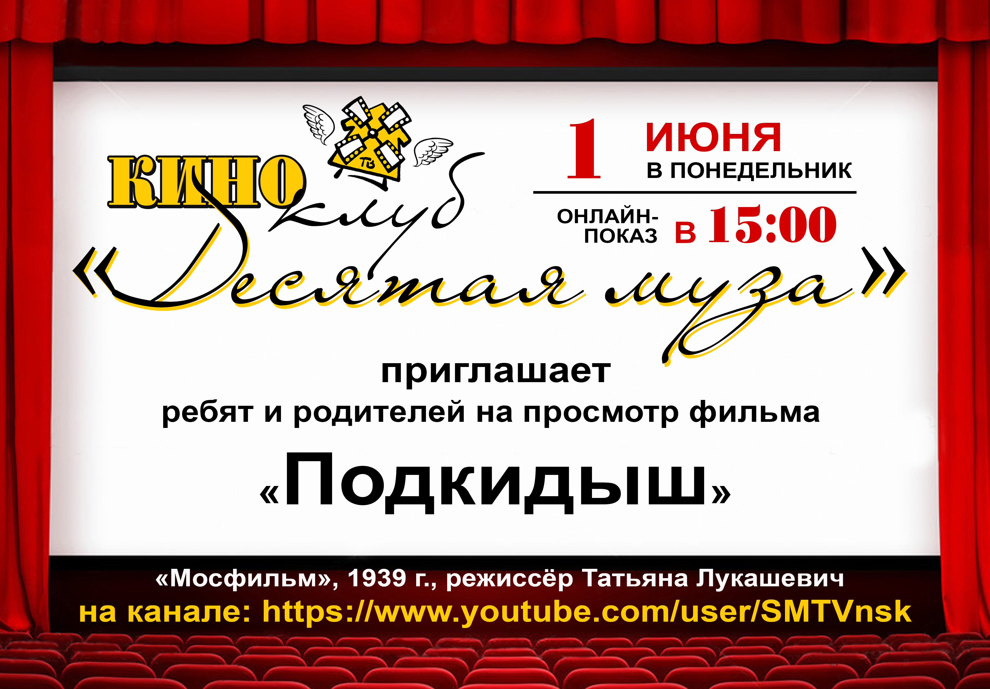 Итак, дорогие читатели и зрители, в рамках очередного показа киноклуба «Десятая муза», посвященного Дню защиты детей, юные зрители, их родители и все желающие увидят кинокомедию «Подкидыш». Онлайн показ состоится сегодня, 1 июня, в 15:00 на нашем канале youtube ДЮЦ «Старая мельница».