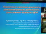 Кривошеева Ирина Федоровна, заведующий МКДОУ д/с № 245, руководитель ГМО воспитателей групп раннего возраста, обозначила основные нормативно-правовые документы федерального, регионального уровней, регламентирующие деятельность групп раннего возраста в дошкольных образовательных организациях: закон от 29.12.2012 № 273-ФЗ «Об Образовании в Российской Федерации», приказ Минобрнауки России «Об утверждении федерального государственного образовательного стандарта дошкольного образования», Стратегия развития воспитания в Российской Федерации на период до 2025 года, распоряжение Правительства Российской Федерации «Об утверждении Концепции развития ранней помощи в Российской Федерации на период до 2020 года», указ Президента Российской Федерации «Об объявлении в Российской Федерации Десятилетия детства», указ Президента Российской Федерации от 7 мая 2018 г. № 204 «О национальных целях и стратегических задачах развития Российской Федерации на период до 2024 г.», распоряжение Правительства Новосибирской области «Об утверждении Концепции развития системы ранней помощи в Новосибирской области на период до 2020 года» и другие.