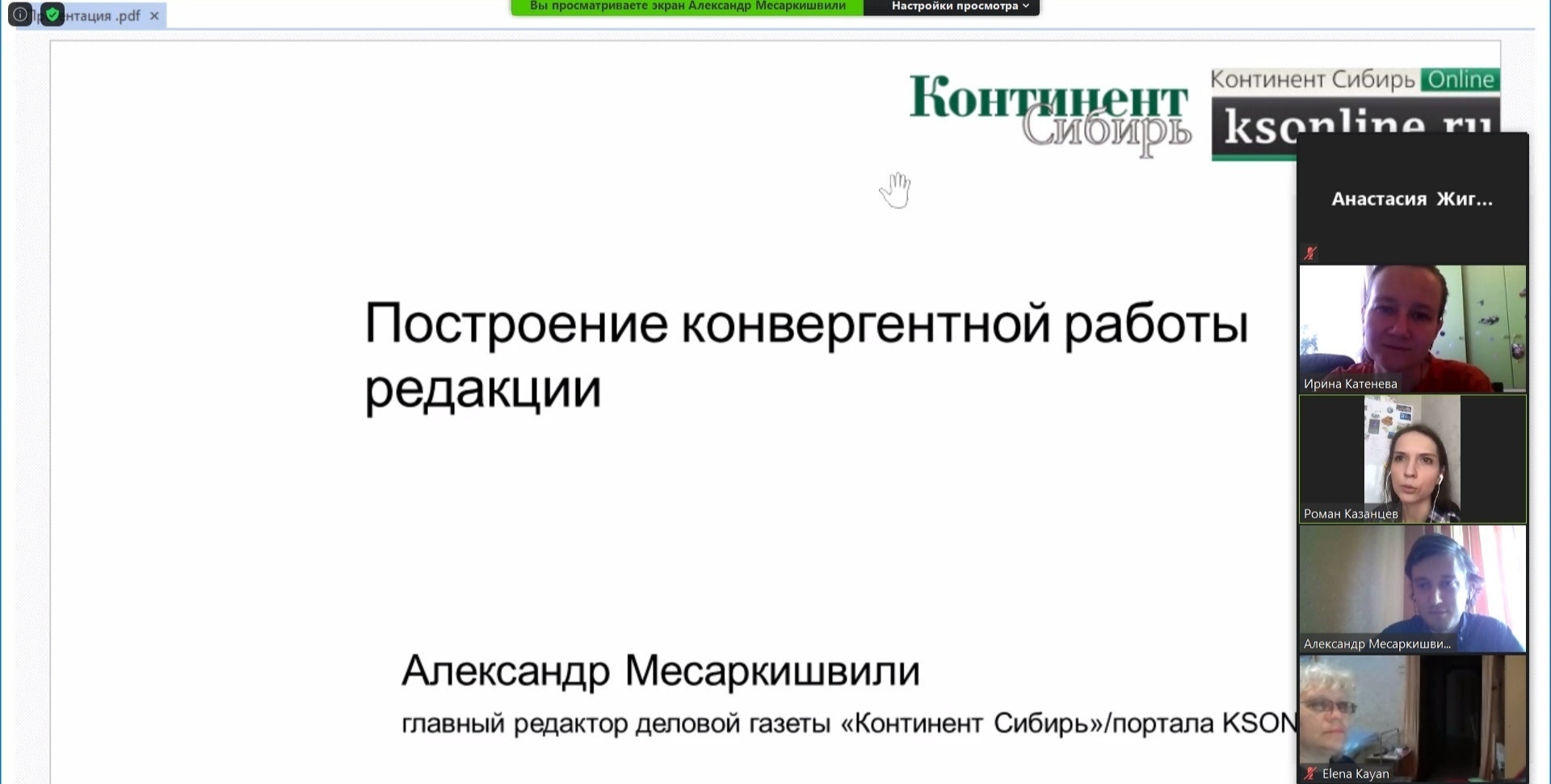 После приветственной части начался мастер-класс Александра Месаркишвили, который был посвящен разбору опыта трансформации классических редакций в конвергентные на примере издания «Континент Сибирь», созданию мультимедийных проектов для разных информационных площадок. На конкретных примерах был разобран процесс превращения стандартных инфоповодов в интересные медиапроекты. Участники мастер-класса смогли задать интересующие их вопросы о признаках конвергентной редакции и о том, какую параллель можно провести со школьными пресс-центрами.