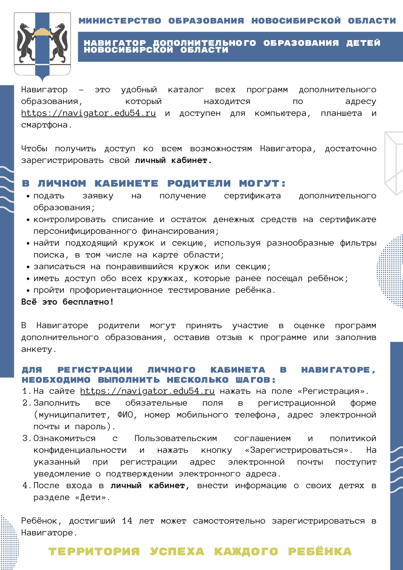 На сайте «Навигатор дополнительного образования детей Новосибирской области» собран материал, который поможет родителям прояснить многие моменты по работе в Навигаторе: памятка по регистрации личного кабинета родителя; видеоматериалы по Навигатору; инструкция для родителей по записи ребёнка на программы обучения; инструкция по добавлению достижений в личном кабинете родителя; журнал «Навигайка» для детей, подростков и родителей.
